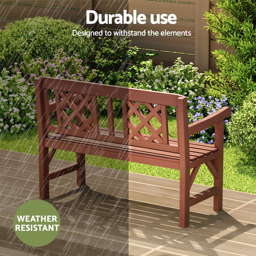 With its appealing rustic vibes, our Gardeon Garden Bench is perfect for outdoor or indoor use. The beautiful natural fir wood construction is meticulously handcrafted to bring out its finest qualities. The finishing is impeccable as is the classic design that will certainly stand the test of time and trends. The lattice-pattern backrest adds character to the bench while also providing sturdy support. With ample space to seat two, the bench features a strong inherent structure that can take weights of up to 250kg with minimum hassle. Not least, the bench is designed to ensure that your comfort is always forefront in its form and function.
