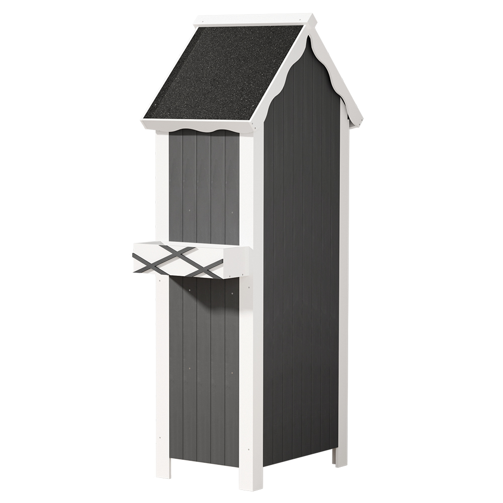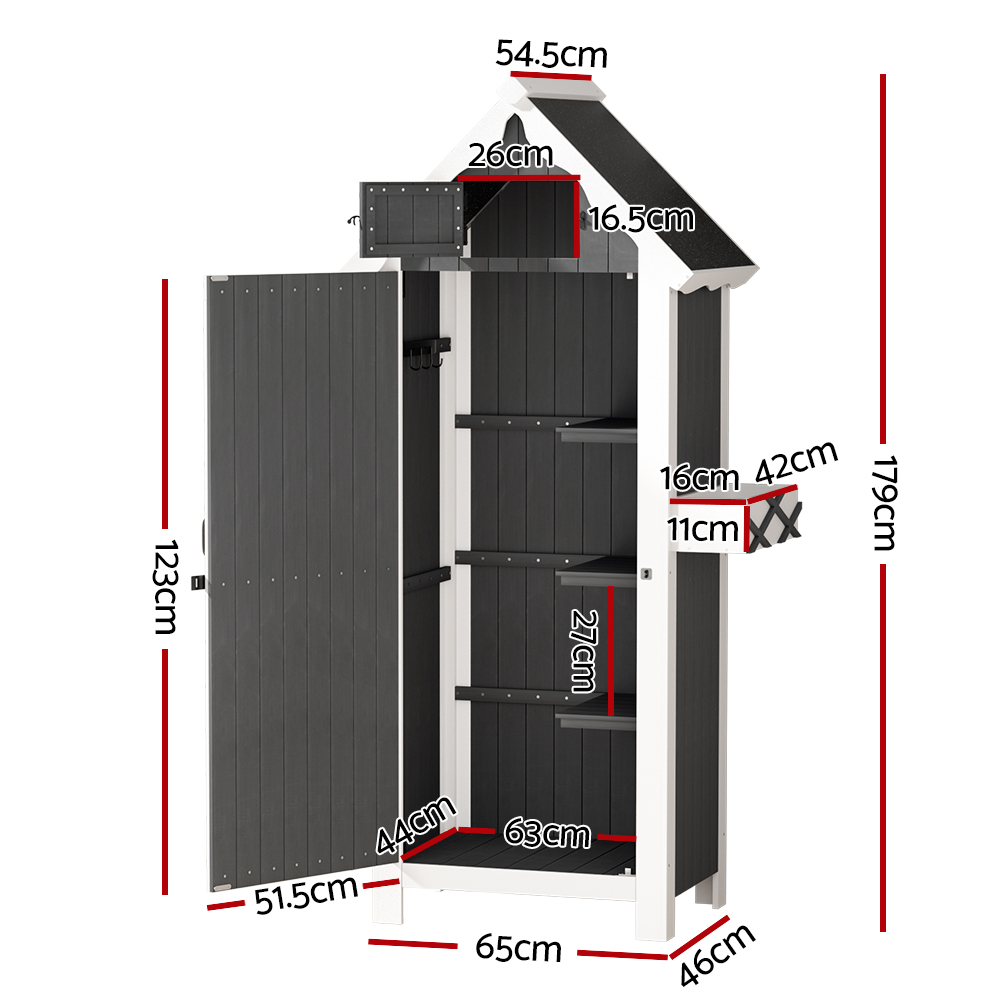 For stylish and practical outdoor furniture that can withstand any weather, look no further than the Gardeon Wooden Storage Shed. The gorgeous cottage shed design is perfect for gardeners in need of generous storage space. The cabinet is made from solid Fir wood and features 3 tiers of shelving, 3 convenient hangers and a cute cuckoo-style upper compartment for all your gardening needs. Its weather-resistant structure and water-resistant asphalt roof will keep it standing through any kind of weather. The magnetic latched door will keep all your goods safe and sound away from the elements and backyard fauna. Use indoors or outdoors for unique rustic appeal. Easy to assemble and even easier to use, youll love the convenience and style of the Gardeon Wooden Storage Shed.