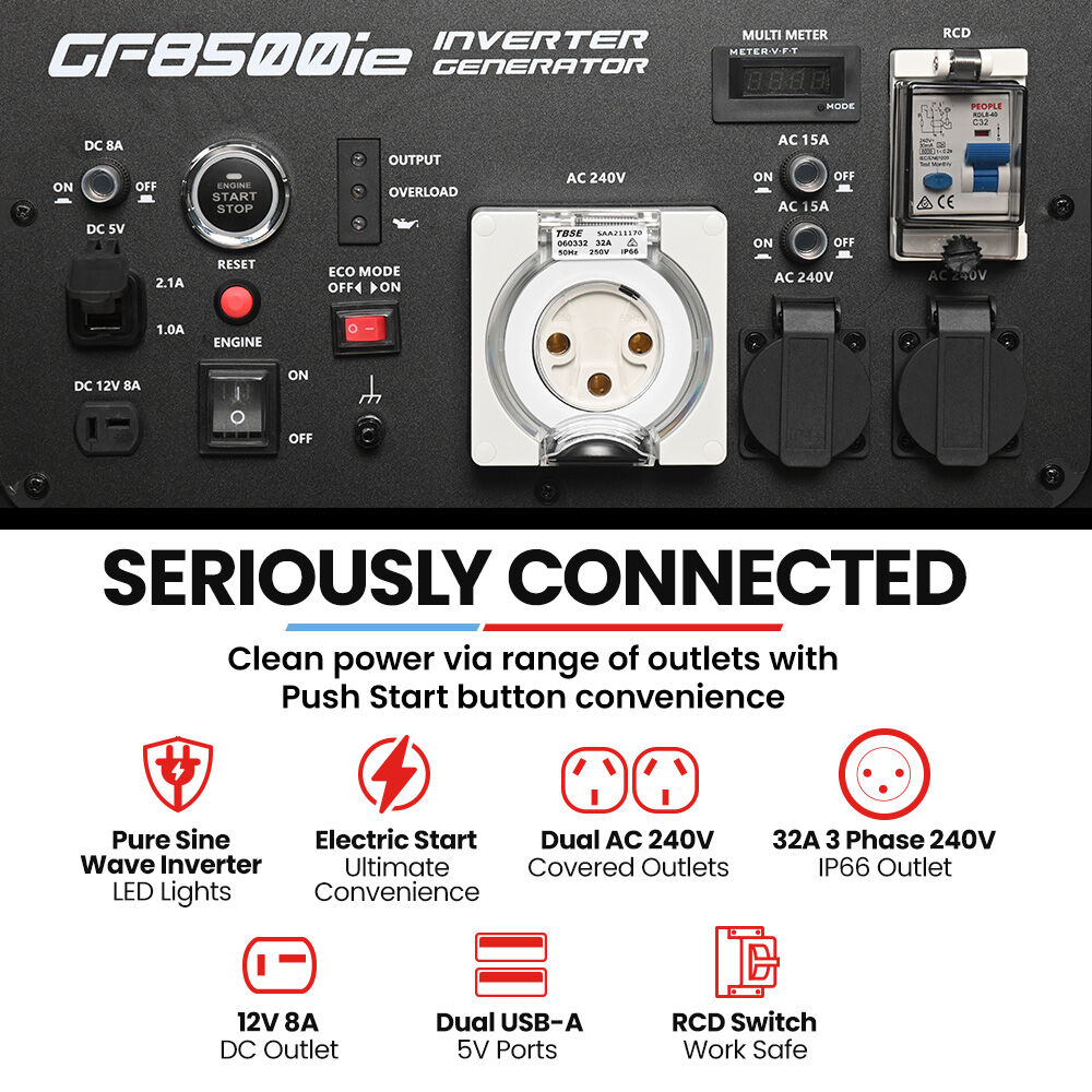 The GF8500ie doesnt compromise on versatility. Its equipped with 2 x 15A outlets, a 32A single phase plug, and dual USB ports, so you can power everything from tools to tech. Safety is built-in with an RCD safety switch and automatic low-oil, overload, and over-temperature protections. The brushless copper alternator ensures durability, and the integrated multimeter keeps performance stats at your fingertips.