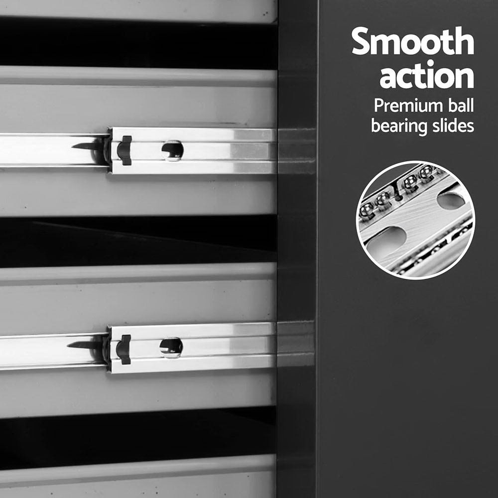 This robust, multi-drawer Giantz Tool Trolley is an essential for any workshop. Crafted from durable steel, it features smooth ball-bearing slides for easy access and a secure lock system for safety. Its spacious design includes varying drawer sizes to accommodate tools of all shapes, complete with non-slip liners. The chest is also mounted on omni-directional castors with locakble front wheels, ensuring a smooth maneuverability and stable positioning. Sleek and functional, it’s perfect for organizing and protecting your valuable tools.