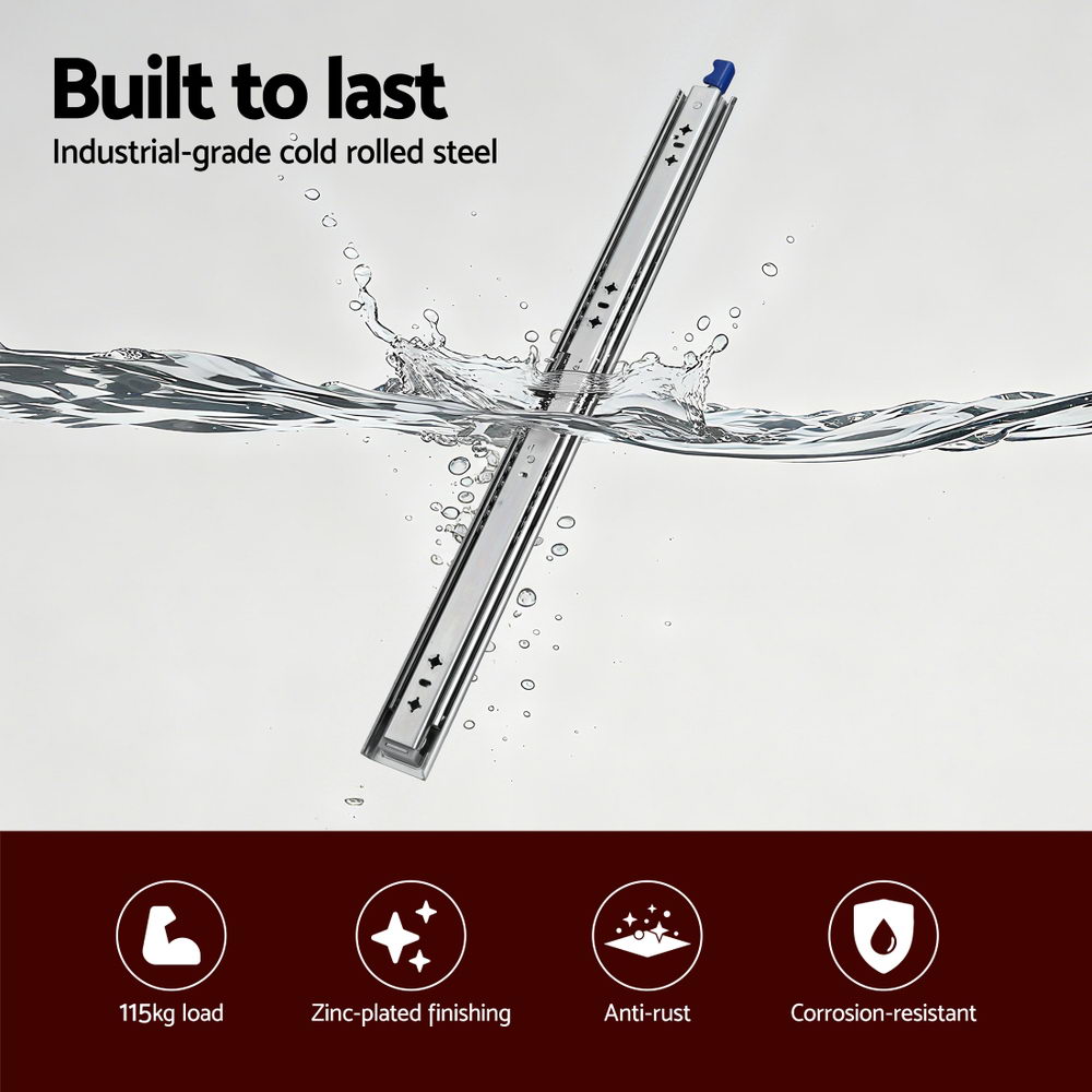 Enhance your storage setup with the Giantz Heavy-Duty Drawer Slides, engineered for superior performance and durability. Available in a range of lengths from 750mm to 1500mm, these slides can handle a substantial load of up to 115kg, making them perfect for your toughest projects. Whether it’s a UTE toolbox, a camper trailer’s storage, or a 4WD cargo system, or household cabinets, these slides provide reliable support. Experience effortless operation with the precision ball bearings, ensuring a smooth and silent glide every time. The integrated nylon buffer design offers a soft and quiet close, while the optimized PP triggers make locking and unlocking simple and safe. Built from thickened zinc-coated cold-rolled steel, these slides are designed for a long lifespan, capable of withstanding over 50,000 opening and closing cycles. The lock-in/lock-out design ensures your drawers stay securely in place on uneven ground. With full extension, you can easily access items at the very back of your drawer, maximising your storage and convenience. Upgrade your drawers with Giantz and enjoy a combination of strength, safety, and smooth functionality.