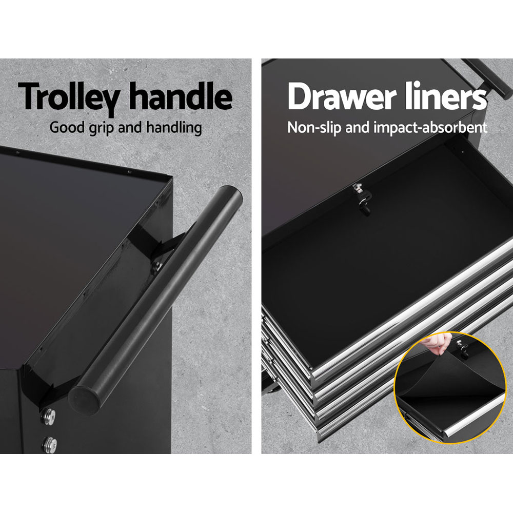 This robust, multi-drawer Giantz Tool Trolley is an essential for any workshop. Crafted from durable steel, it features smooth ball-bearing slides for easy access and a secure lock system for safety. Its spacious design accommodate tools of all shapes, complete with non-slip liners. The chest is also mounted on omni-directional castors with locakble front wheels, ensuring a smooth maneuverability and stable positioning. Sleek and functional, it’s perfect for organizing and protecting your valuable tools.