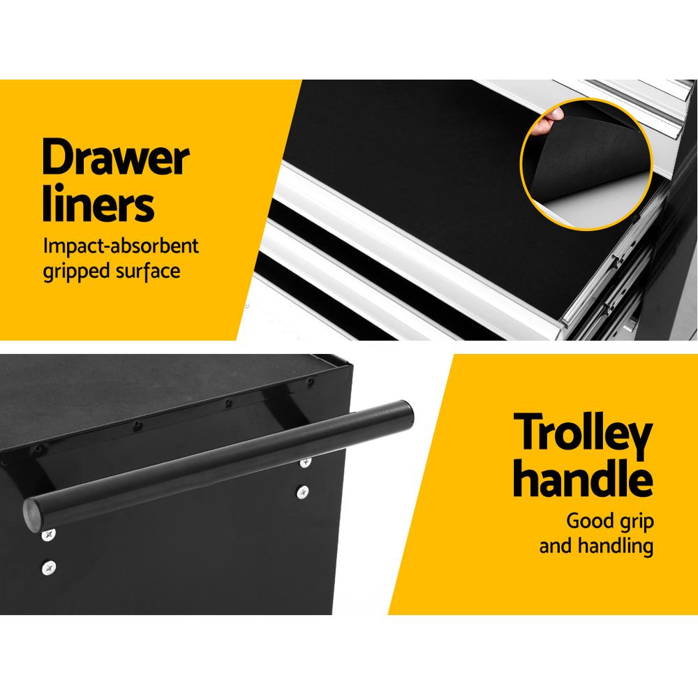This robust, multi-drawer Giantz Tool Trolley is an essential for any workshop. Crafted from durable steel, it features smooth ball-bearing slides for easy access and a secure lock system for safety. Its spacious design includes varying drawer sizes to accommodate tools of all shapes, complete with non-slip liners. The chest is also mounted on omni-directional castors with locakble front wheels, ensuring a smooth maneuverability and stable positioning. Sleek and functional, it’s perfect for organizing and protecting your valuable tools.