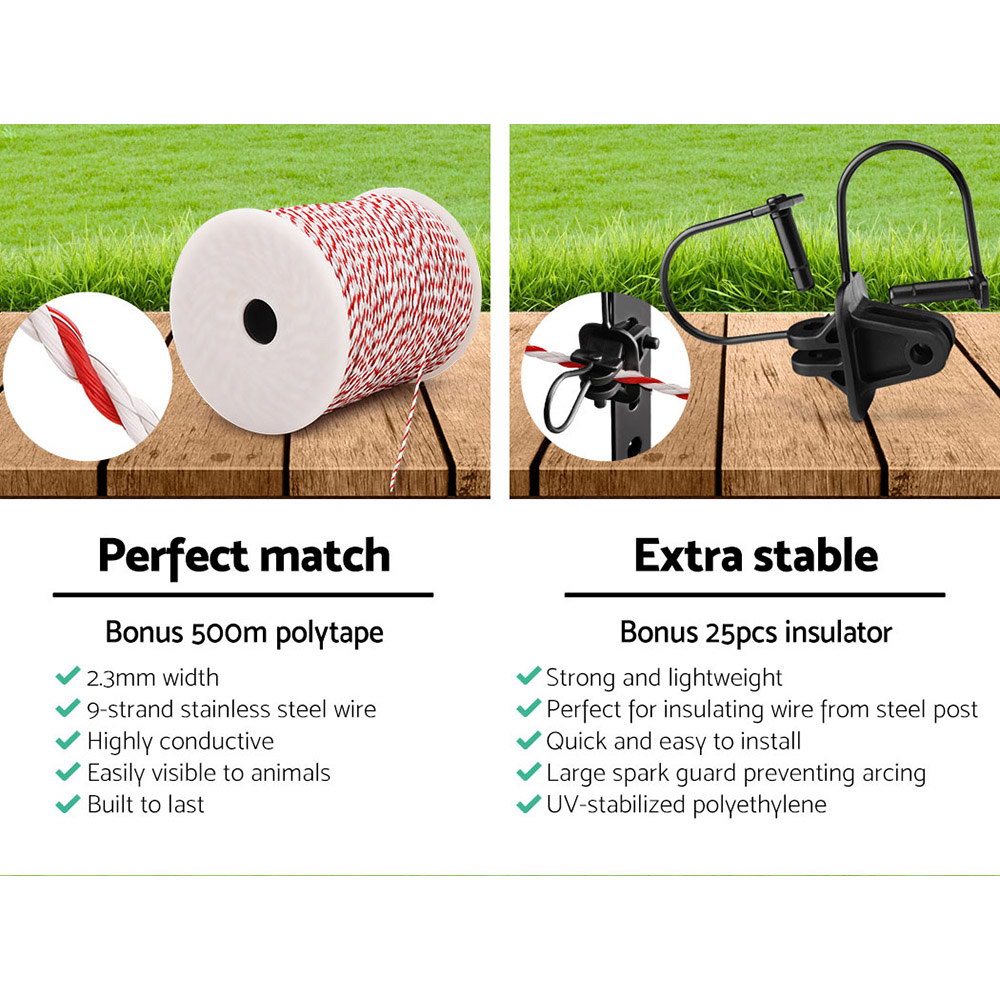 Giantz Fence Energiser 5KM Solar Powered Electric 500M Poly Wire Insulator