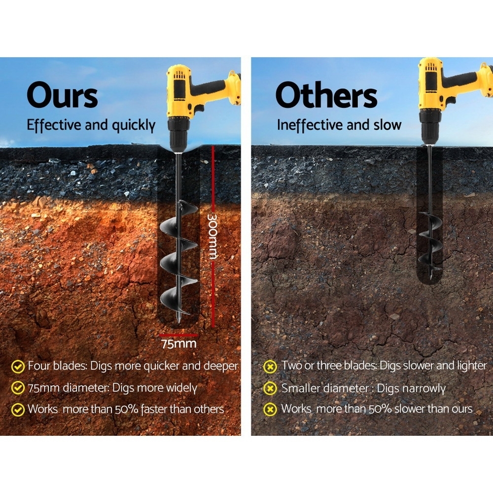 For past preparation of planting groundwork, nothing beats the Giantz Power Auger to complement your power digging. The augur is made of heavy-duty steel for durability and strength and will not easily succumb to tough handling and drilling. It can dig up to 30cm deep depending on the model with a 7.5cm diameter hole and is compatible for use with most power drills. It will fit into a 13mm chuck perfectly. It can used in most ground surfaces including solid clay, gravel soil, sand and shale soil.