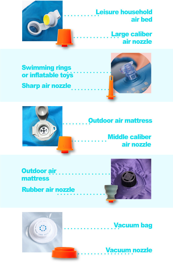 - 5 nozzles:It comes with 4different nozzles to fit most air mattresses, inflatable pool floats, swimming rings,yoga ball and kid’s toys