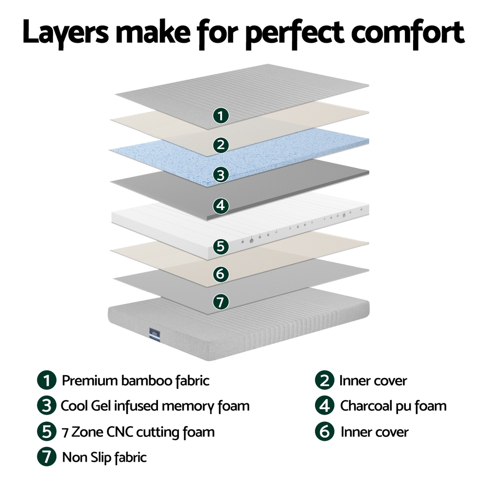 Giselle Bedding Cool Gel Memory Foam Mattress Charcoal 7-Zone Washable Bamboo Cover 15cm Single