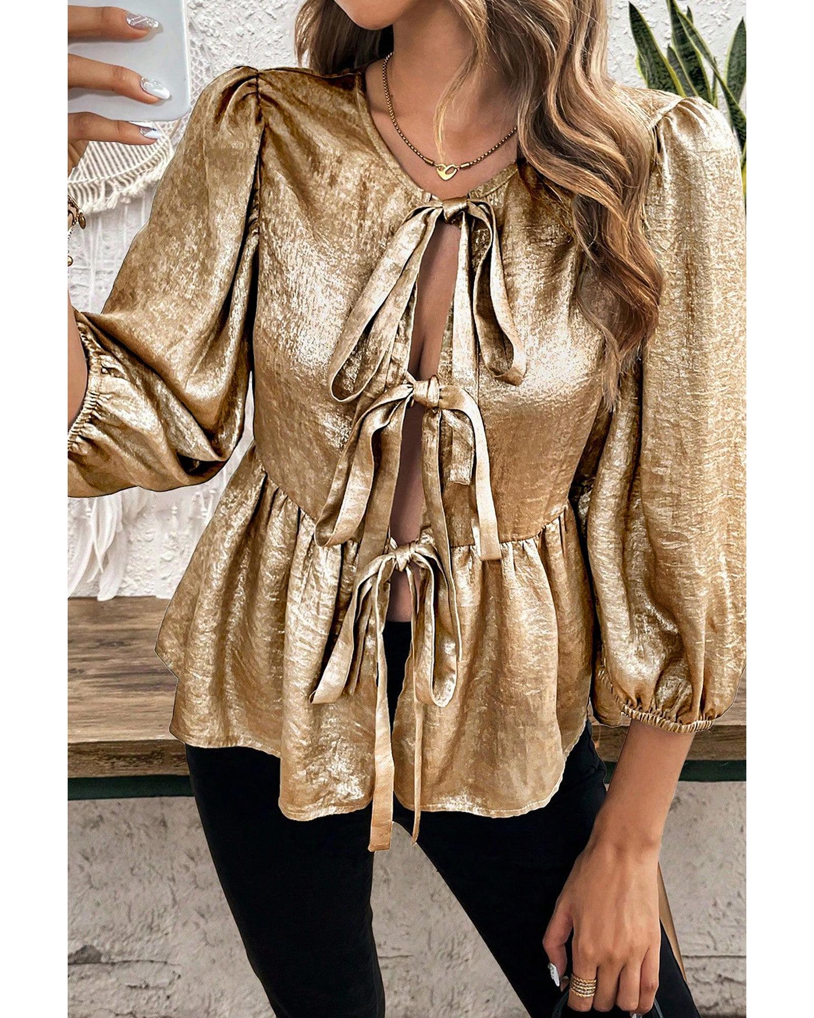 - Gold Bow Tie Front Puff 3/4 Sleeve Ruffle Hem Blouse