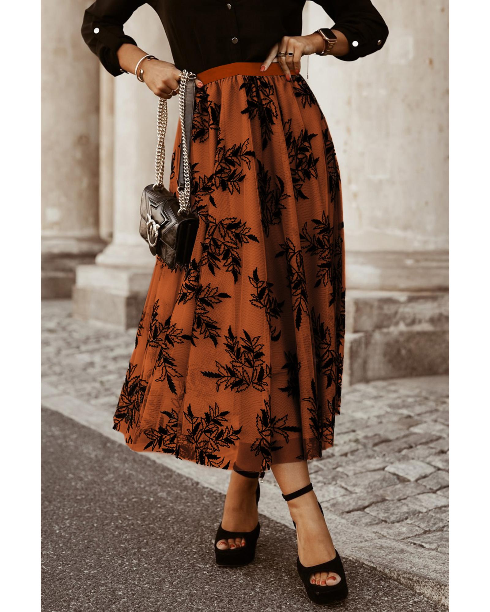 Gold Flame Floral Leaves Embroidered High Waist Maxi Skirt – L
