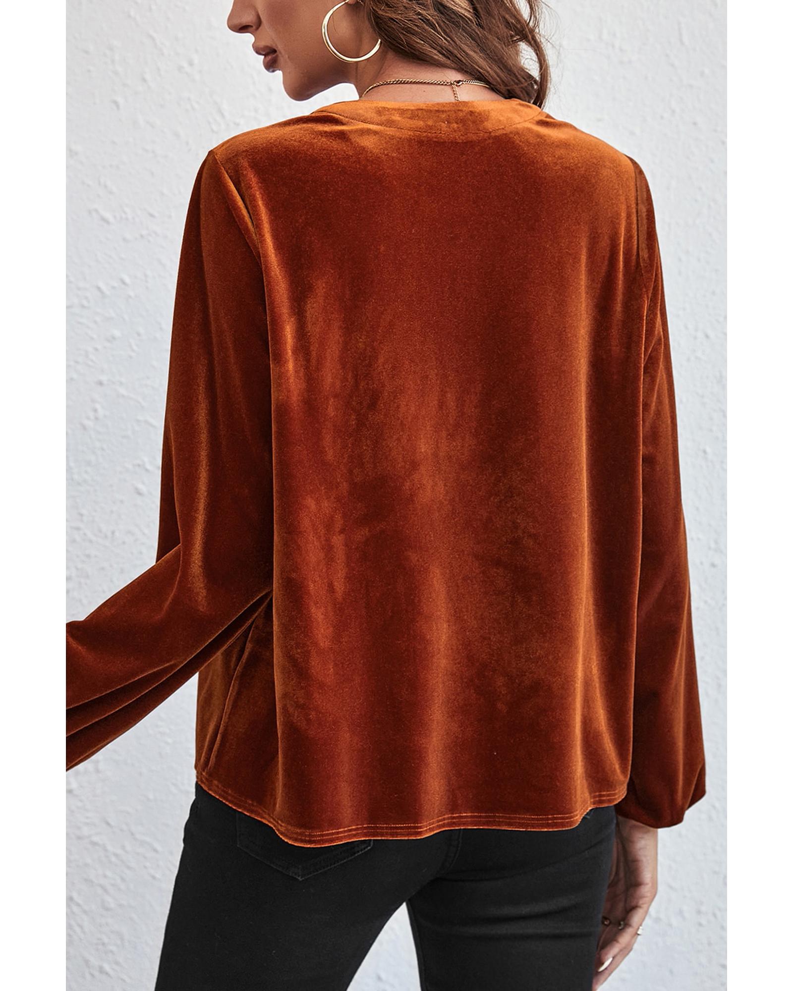 Gold Flame Lantern Sleeve Beaded Split V Neck Velvet Top – L