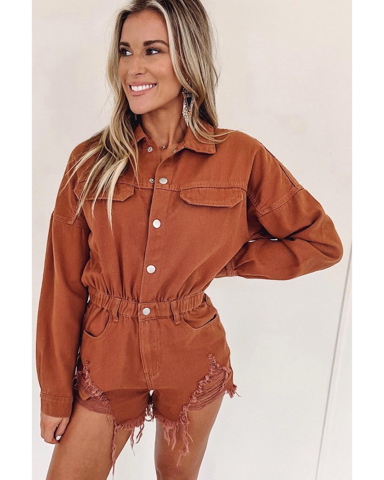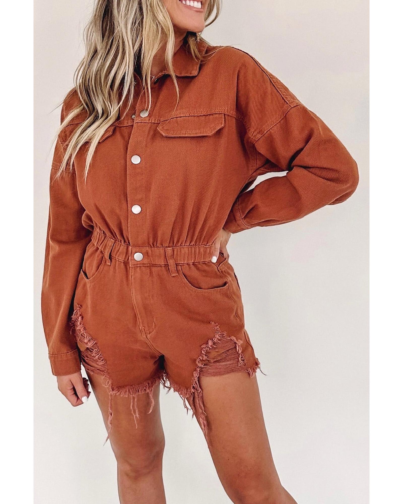 Gold Flame Long Sleeve Snap Buttons Distressed Denim Romper – XL