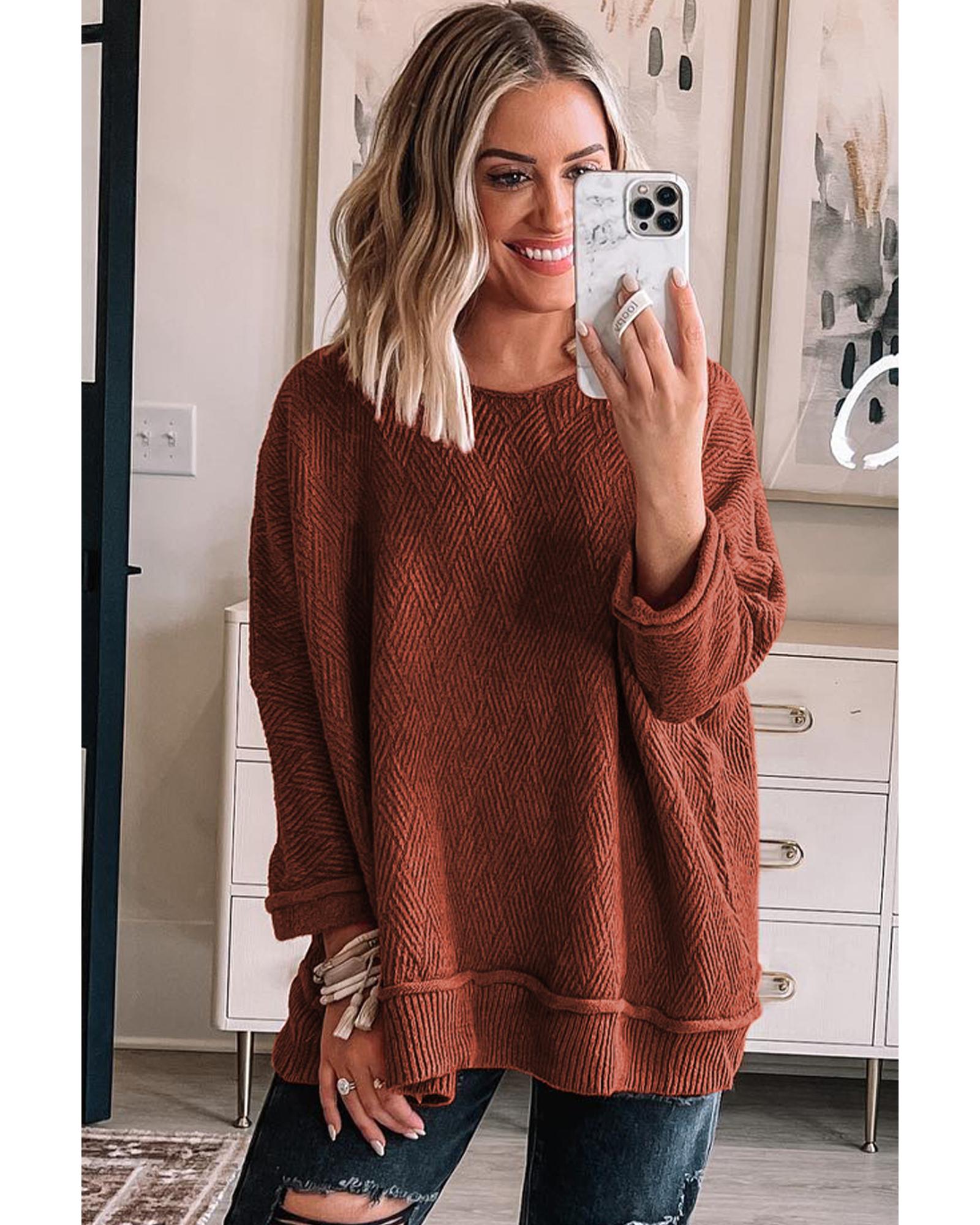 Gold Flame Solid Color Textured Crew Neck Loose Sweater – M