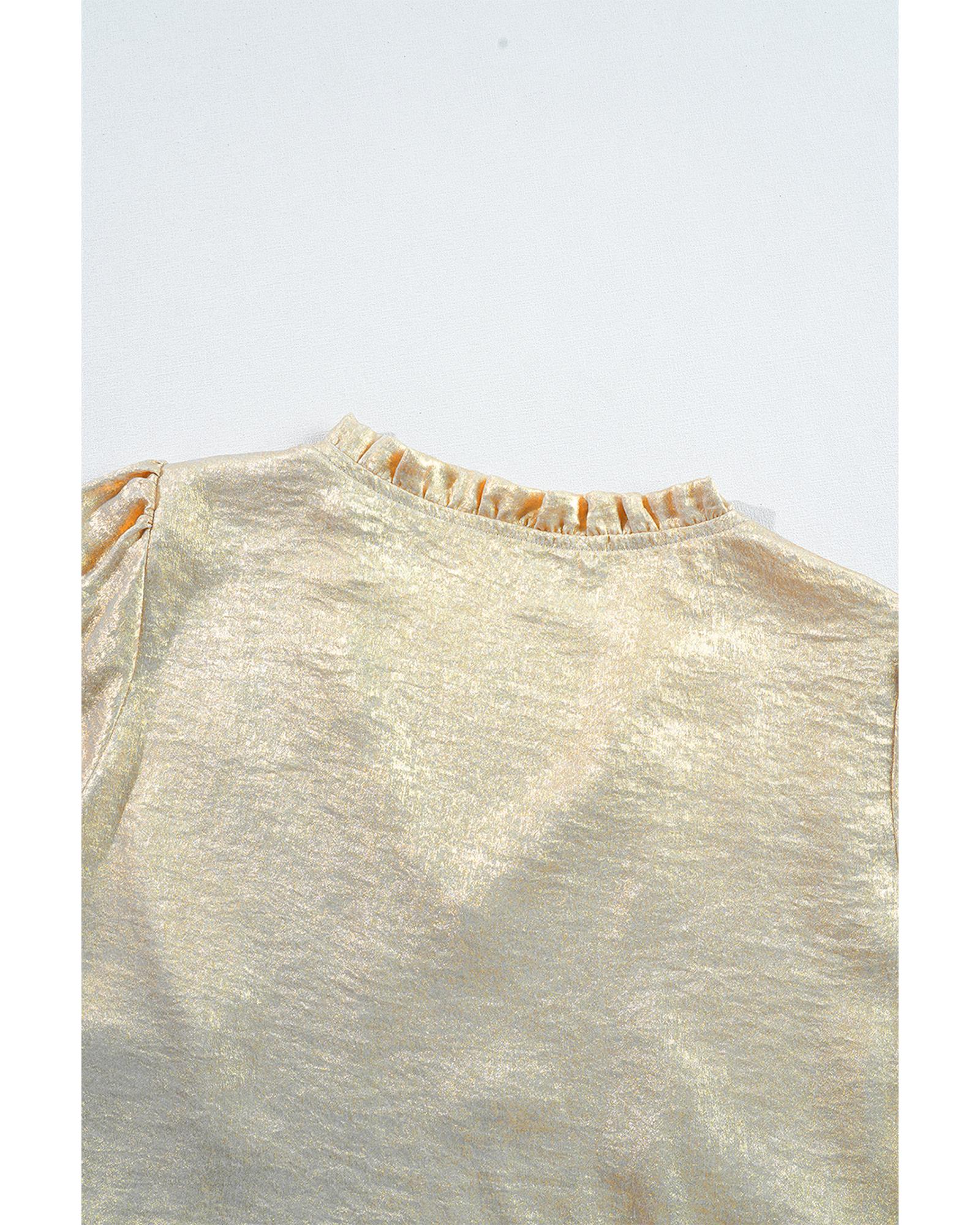 Gold Metallic Frilled V Neck Puff Sleeve Babydoll Blouse – L