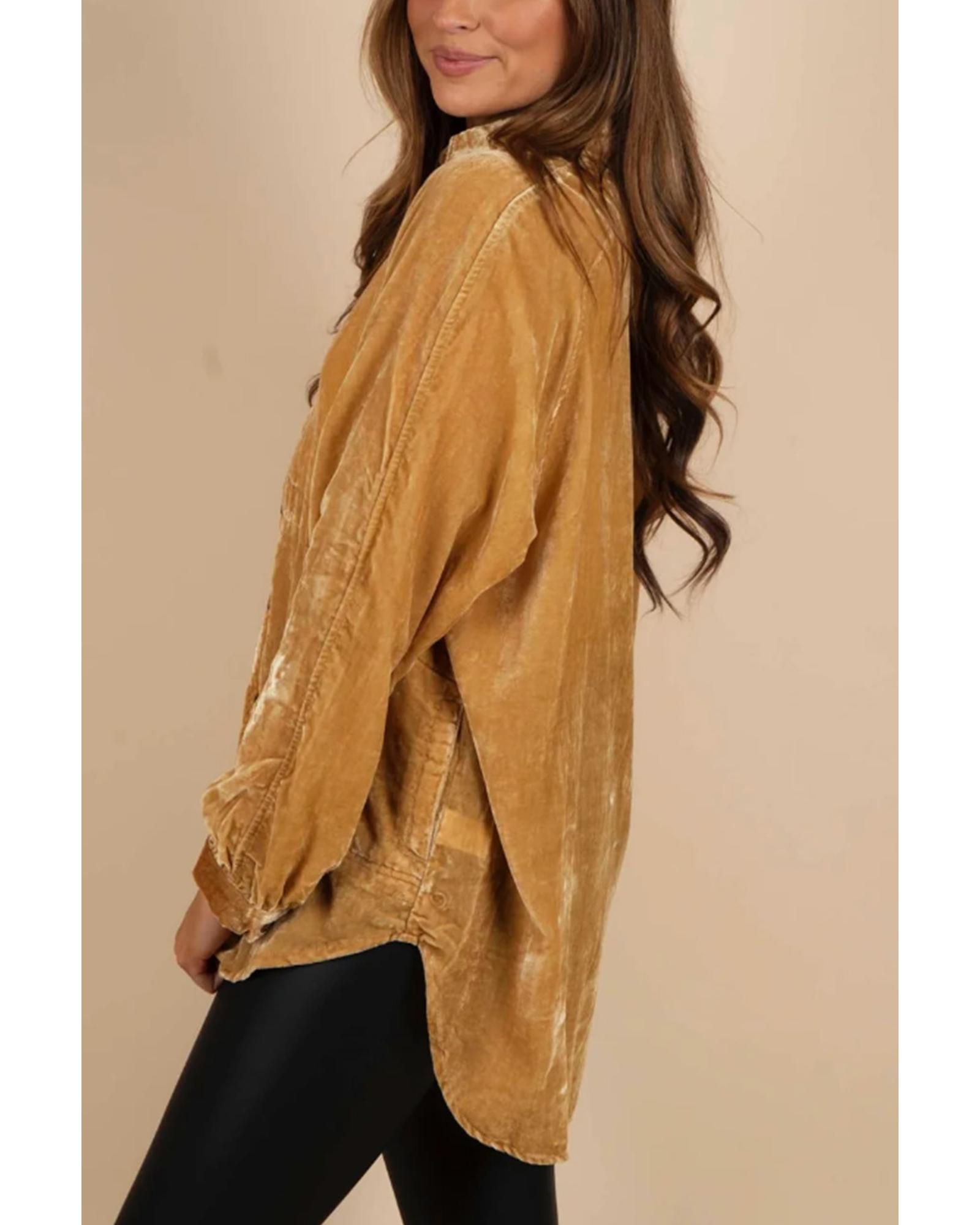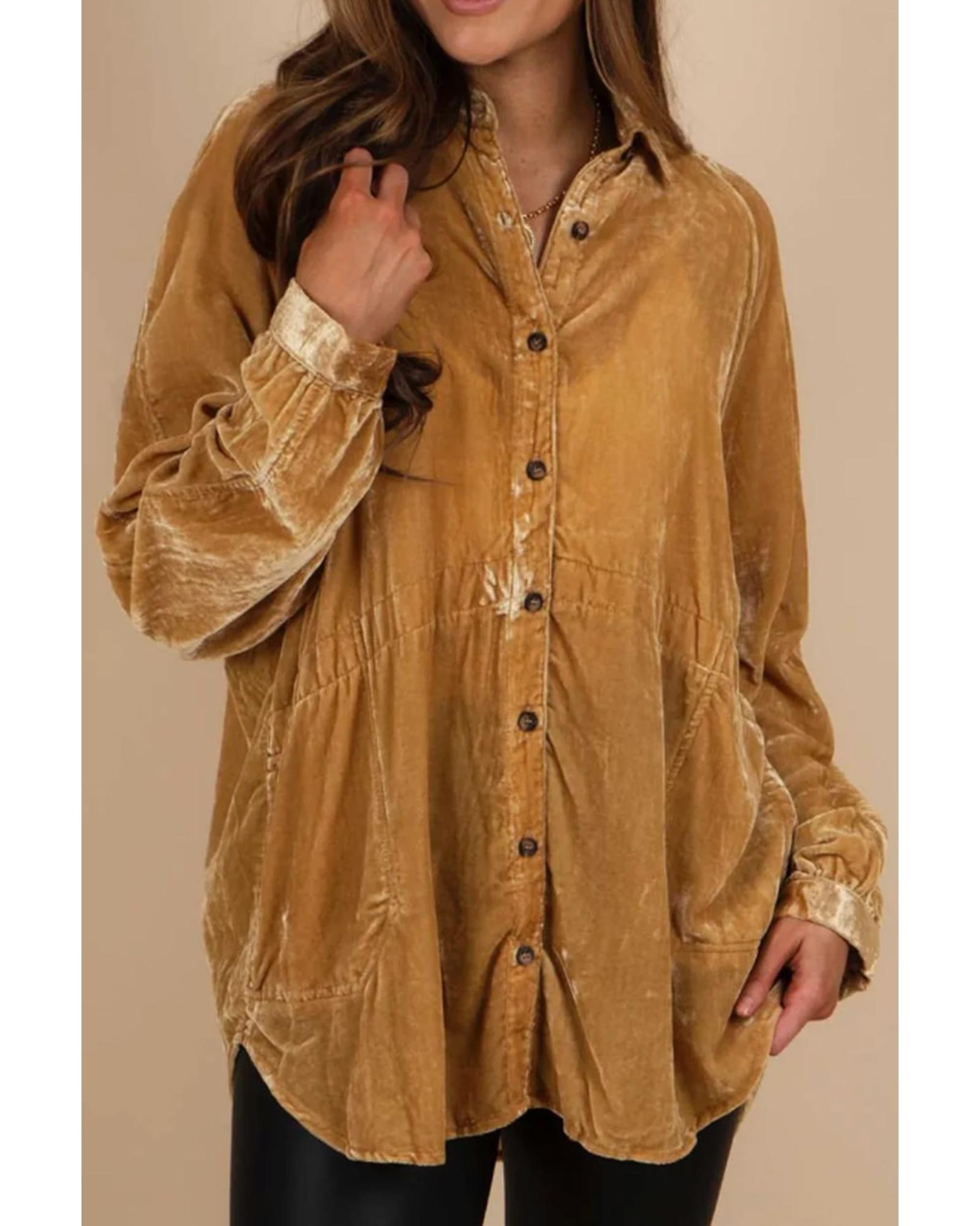 Gold Solid Color Button Up Loose Fit Velvet Shirt – S
