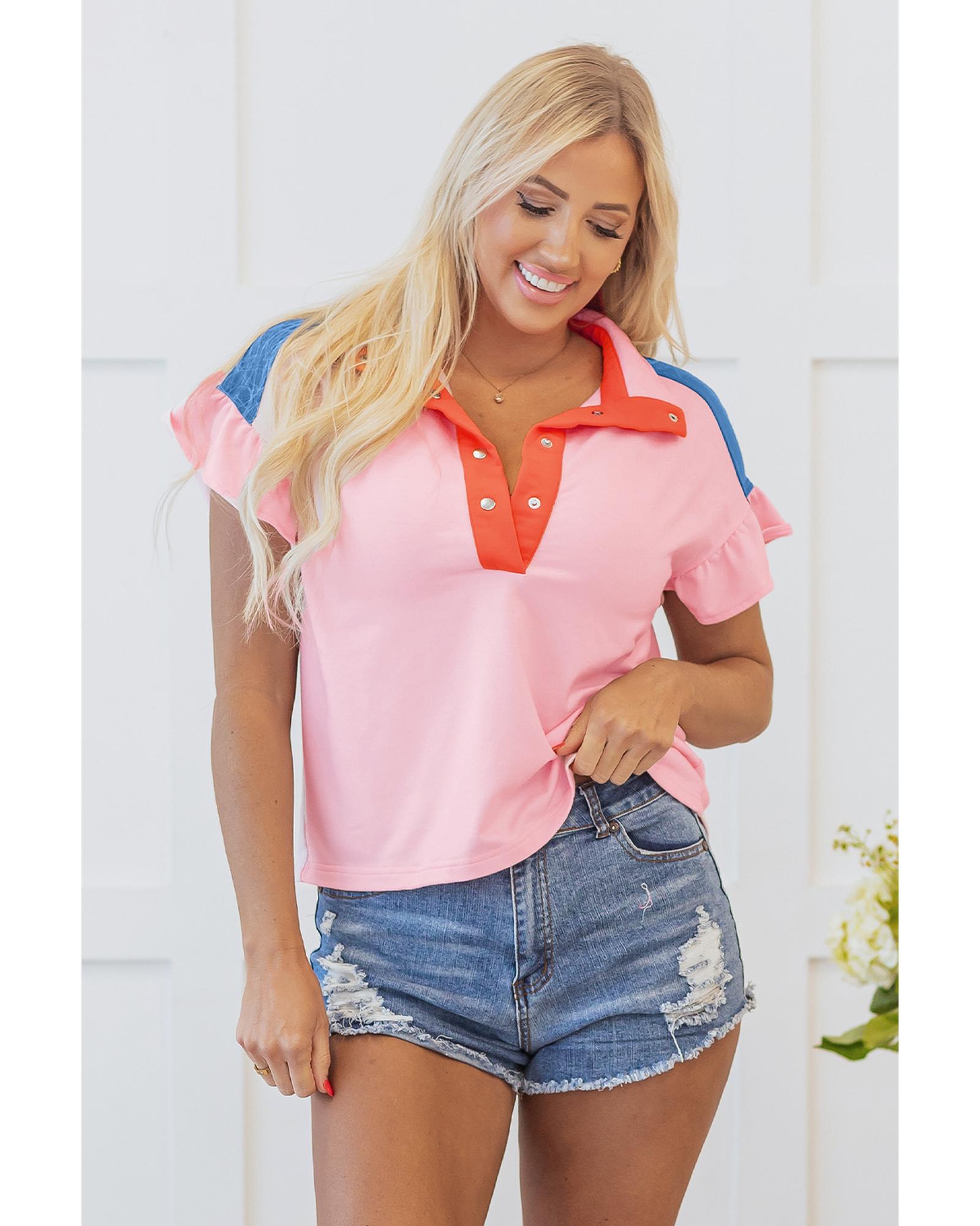 Gossamer Pink Color Block Half Buttoned Ruffled Short Sleeve T Shirt – L