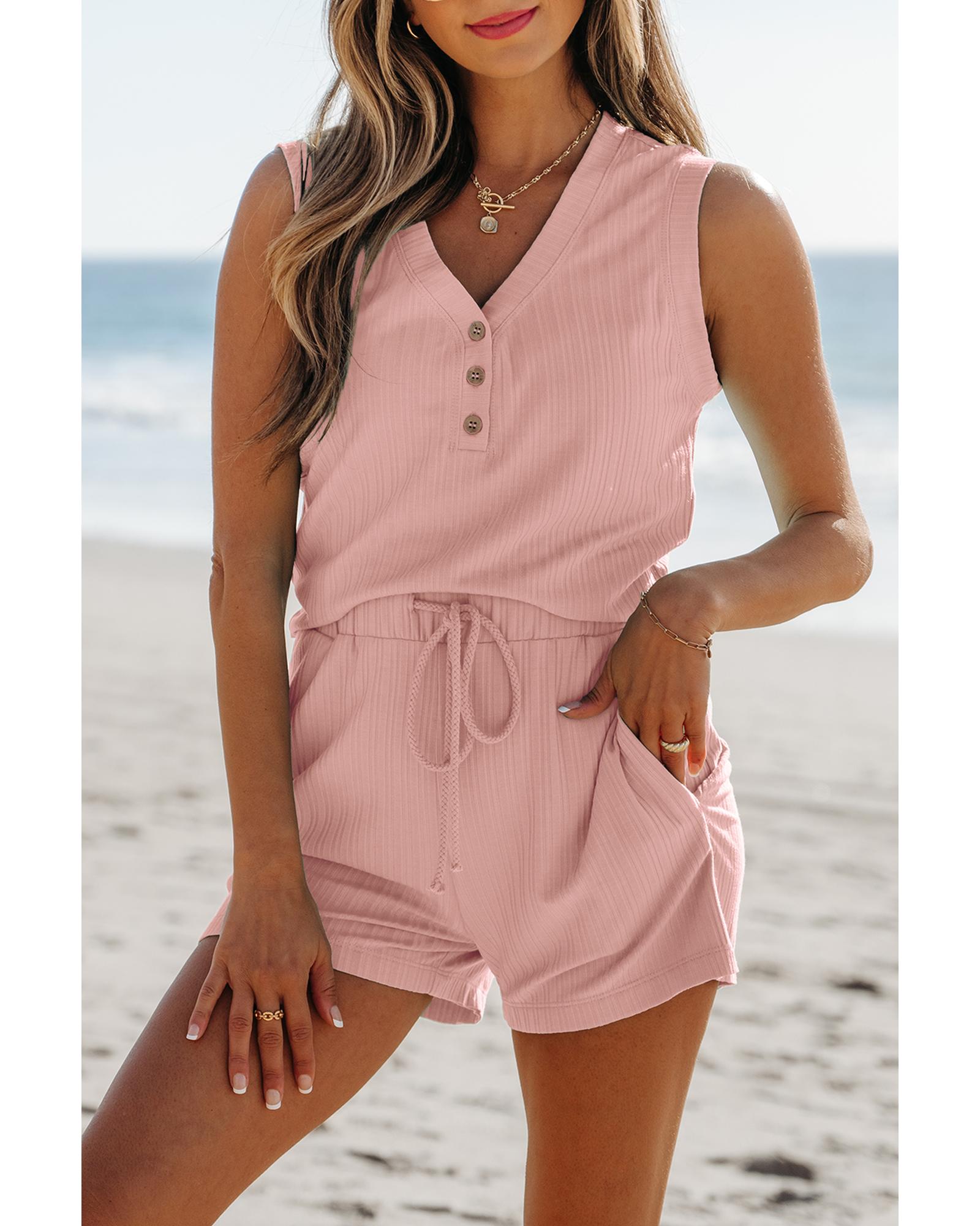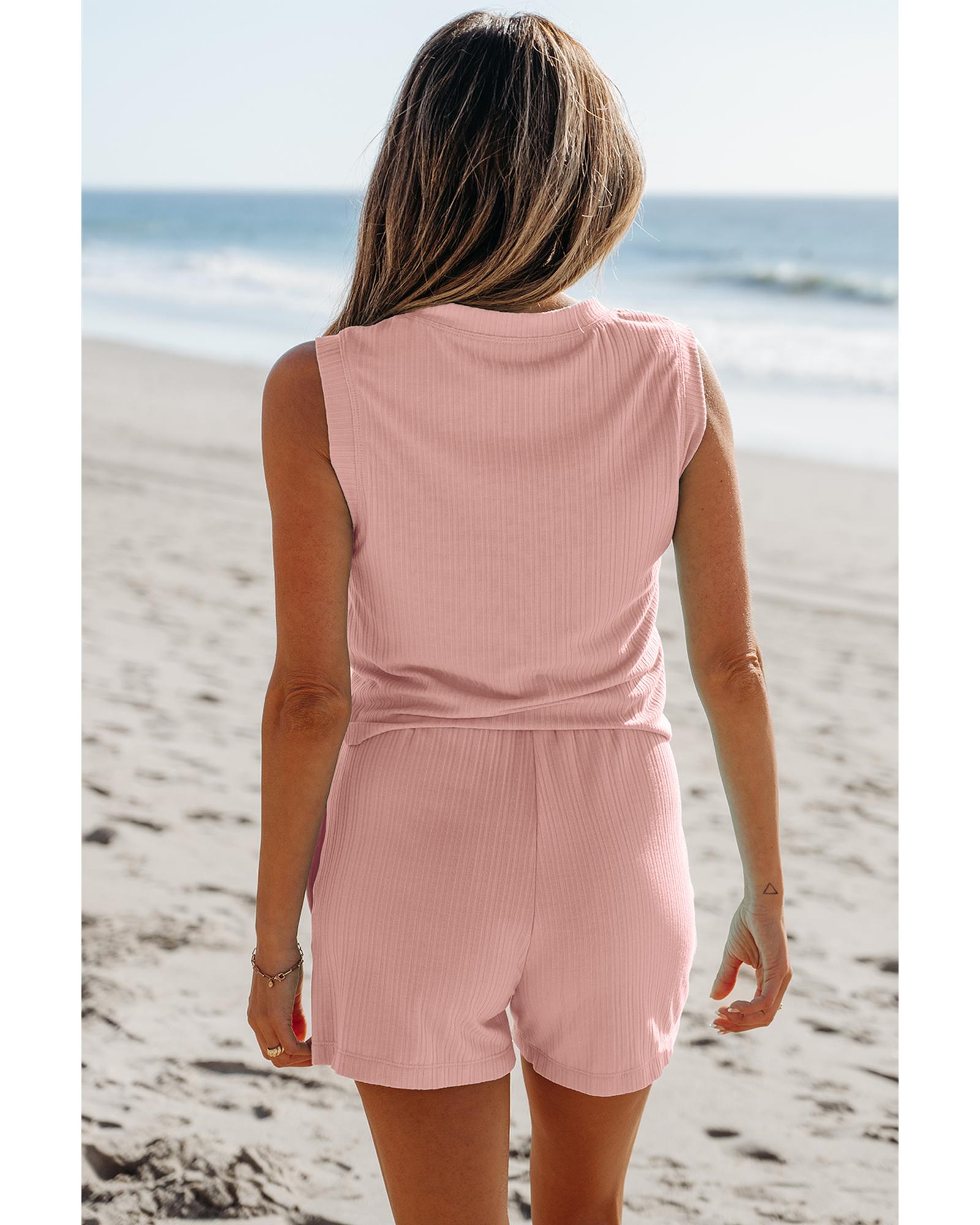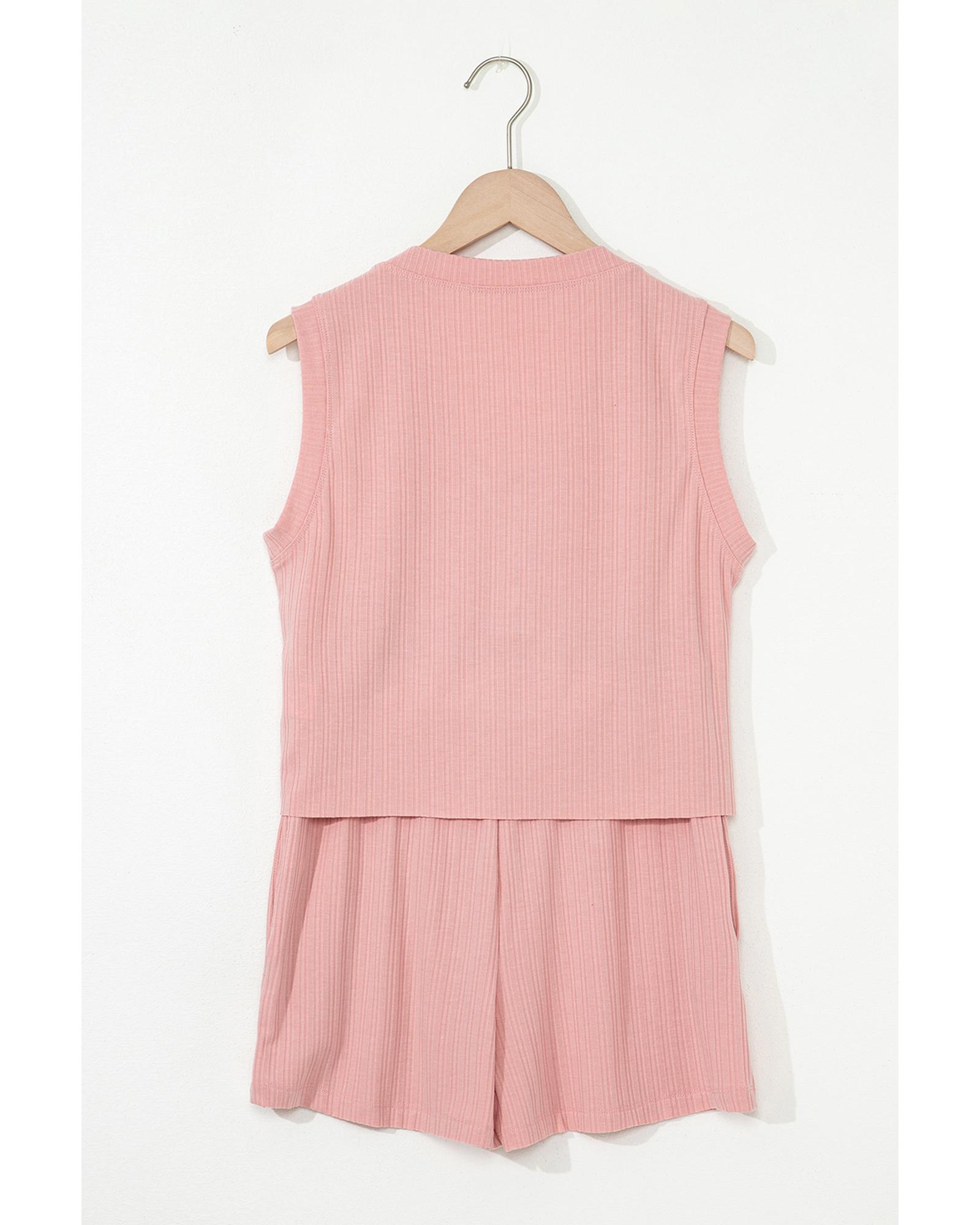 Gossamer Pink Ribbed Button V Neck Tank Top and Shorts Set – S