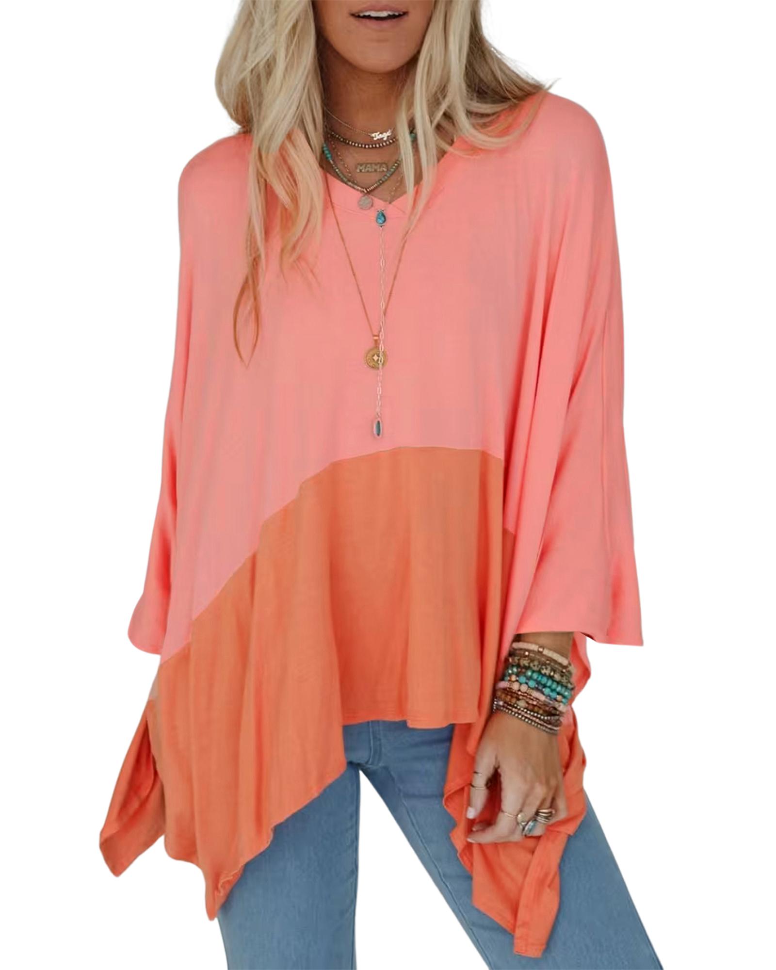 • Grapefruit Orange Contrast Color Patchwork Oversized Side Split Top