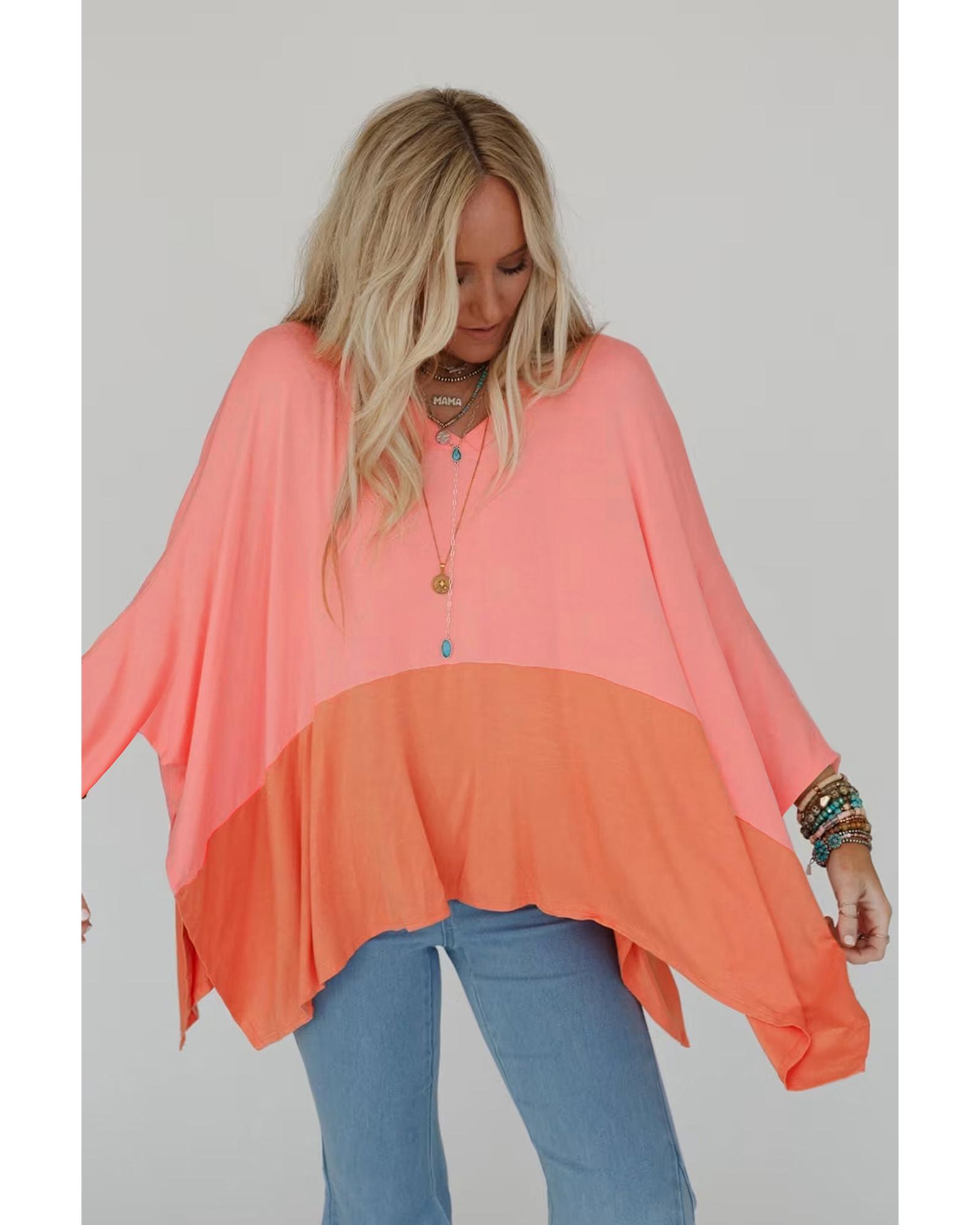 Grapefruit Orange Contrast Color Patchwork Oversized Side Split Top – XL