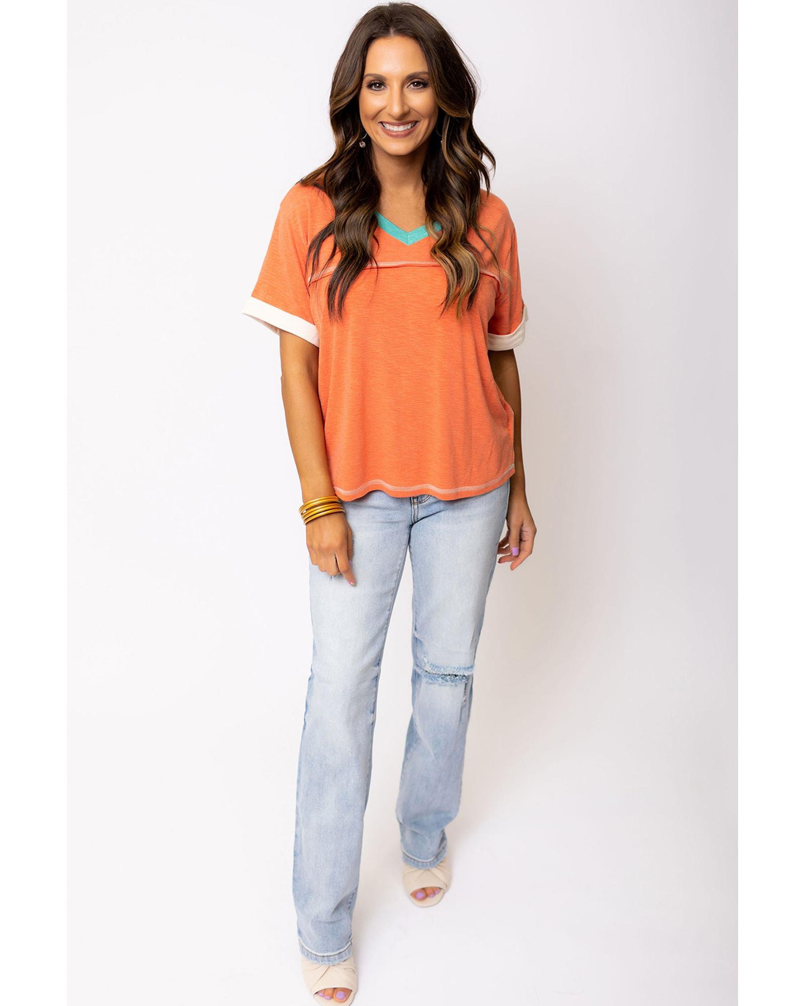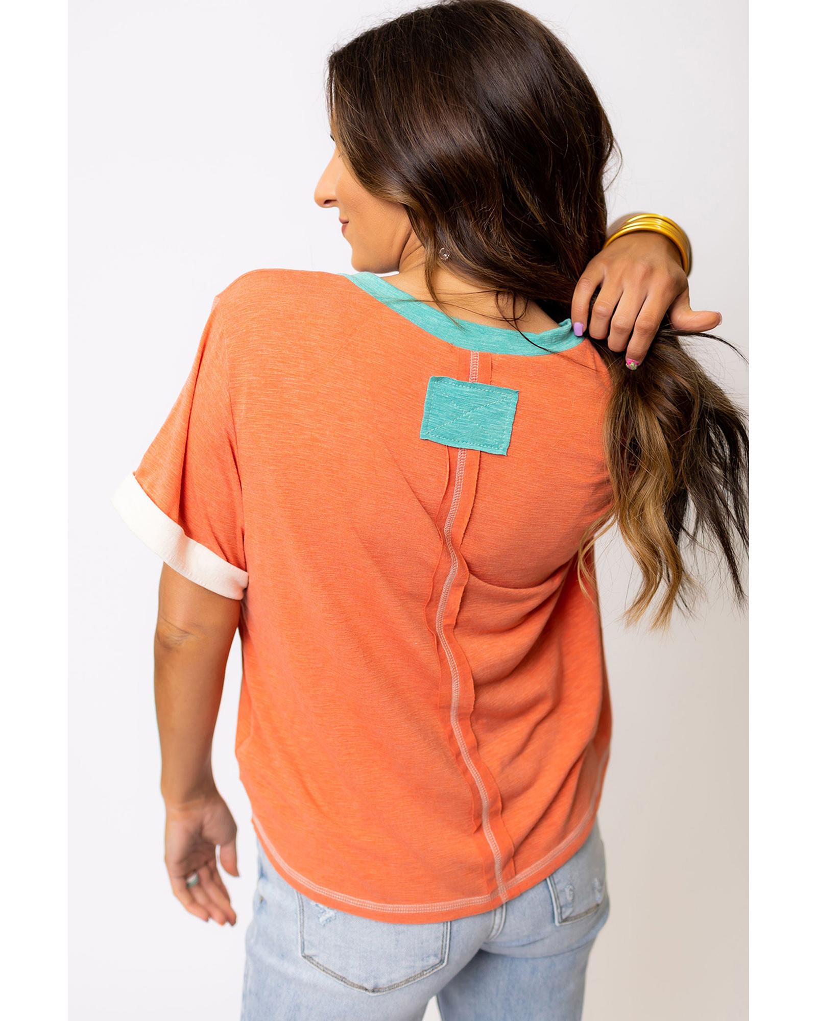 Grapefruit Orange Contrast Trim Exposed Seam V Neck T-shirt – S