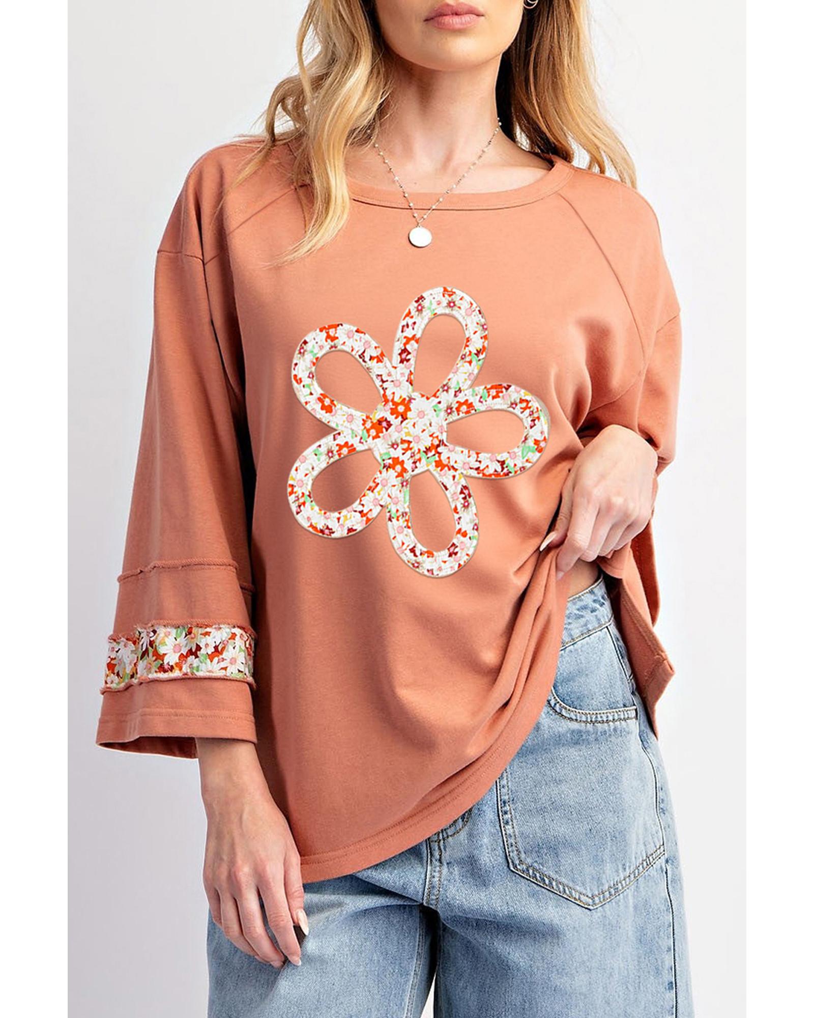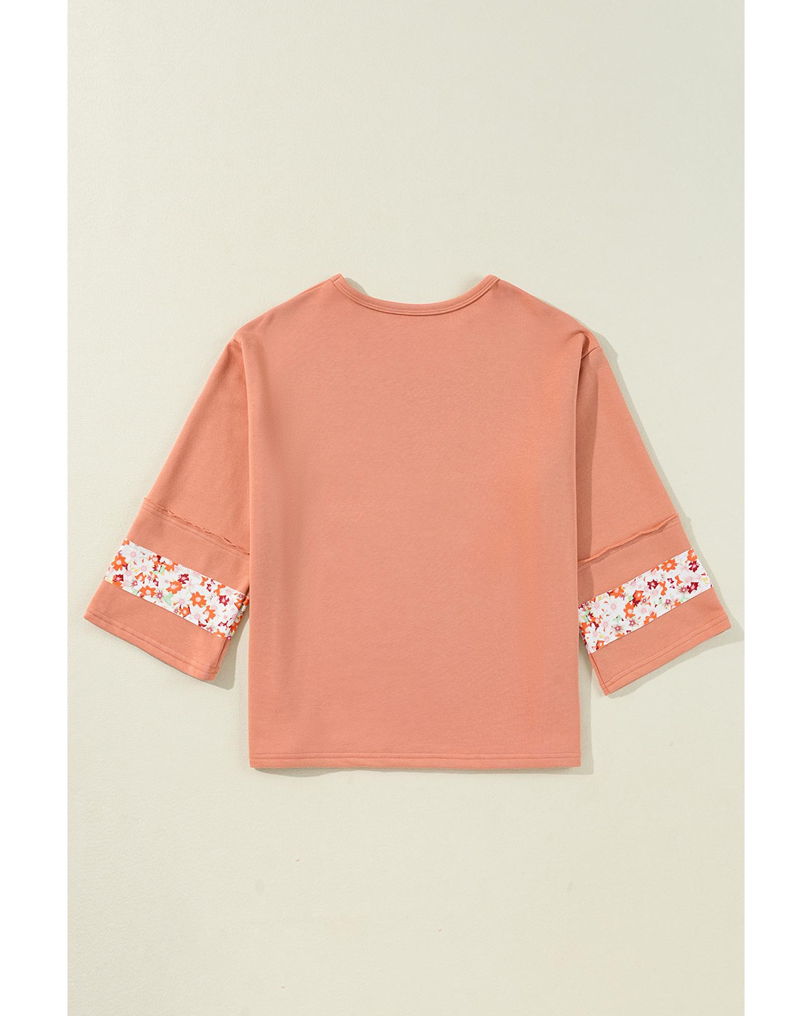 Grapefruit Orange Flower Patch Graphic Exposed Seam Wide Sleeve Top – L