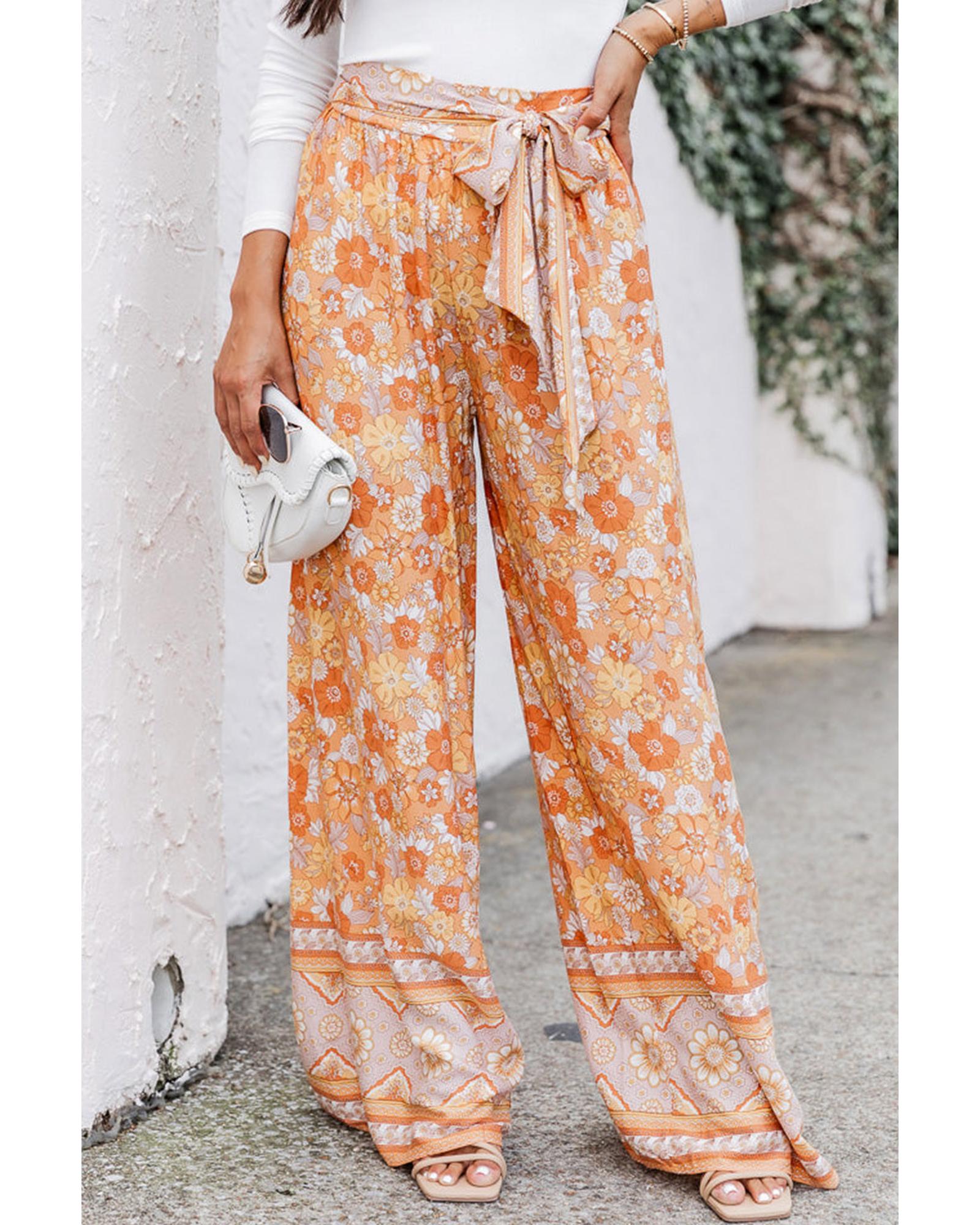 • Grapefruit Orange Tie Waist Boho Floral Wide Leg Pants