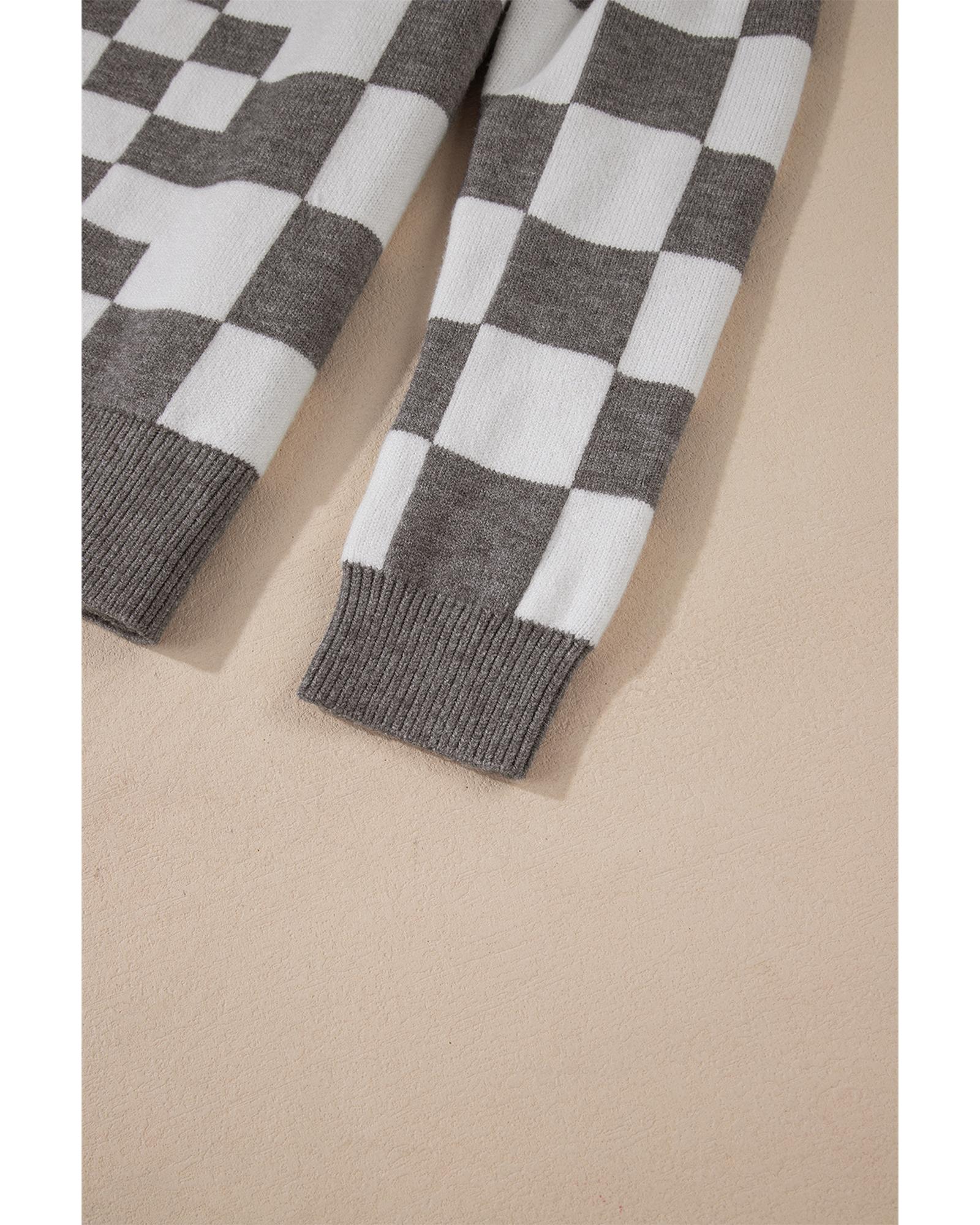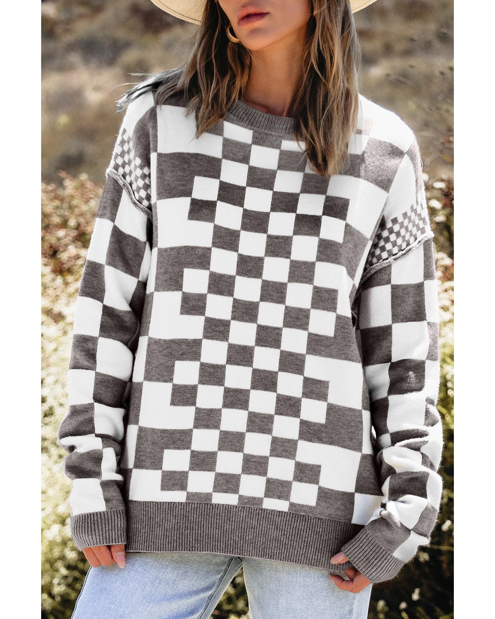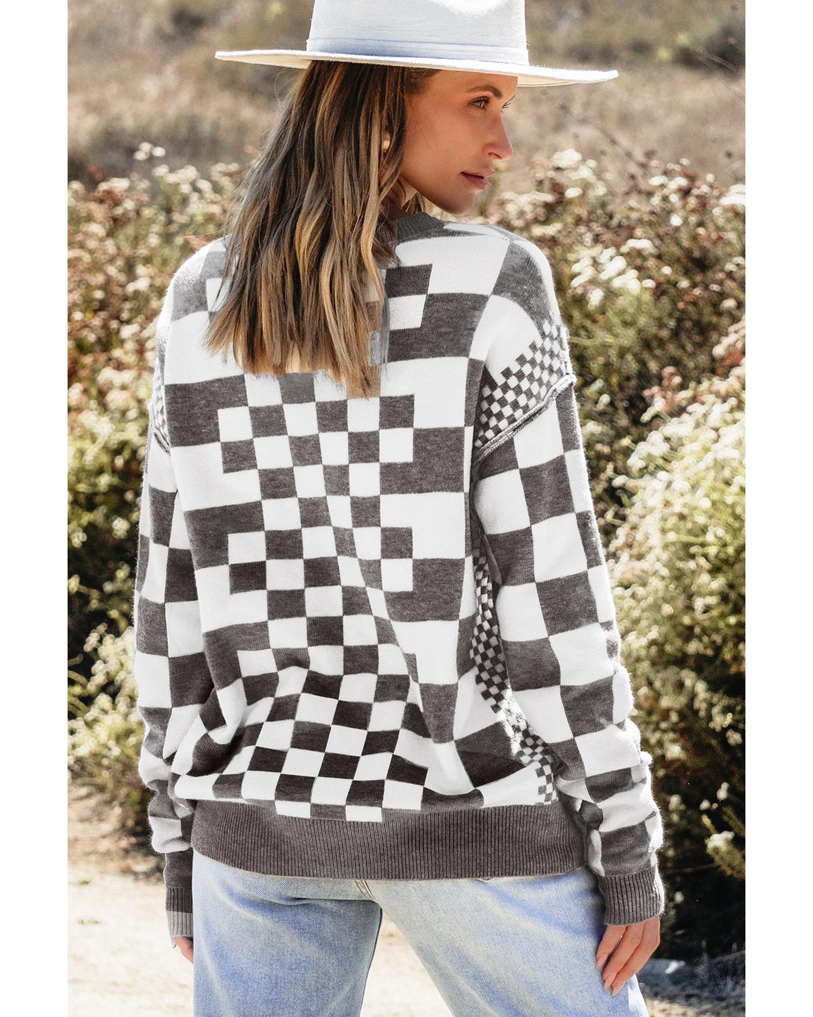 Gray Checkered Print Drop Shoulder Round Neck Sweater – S