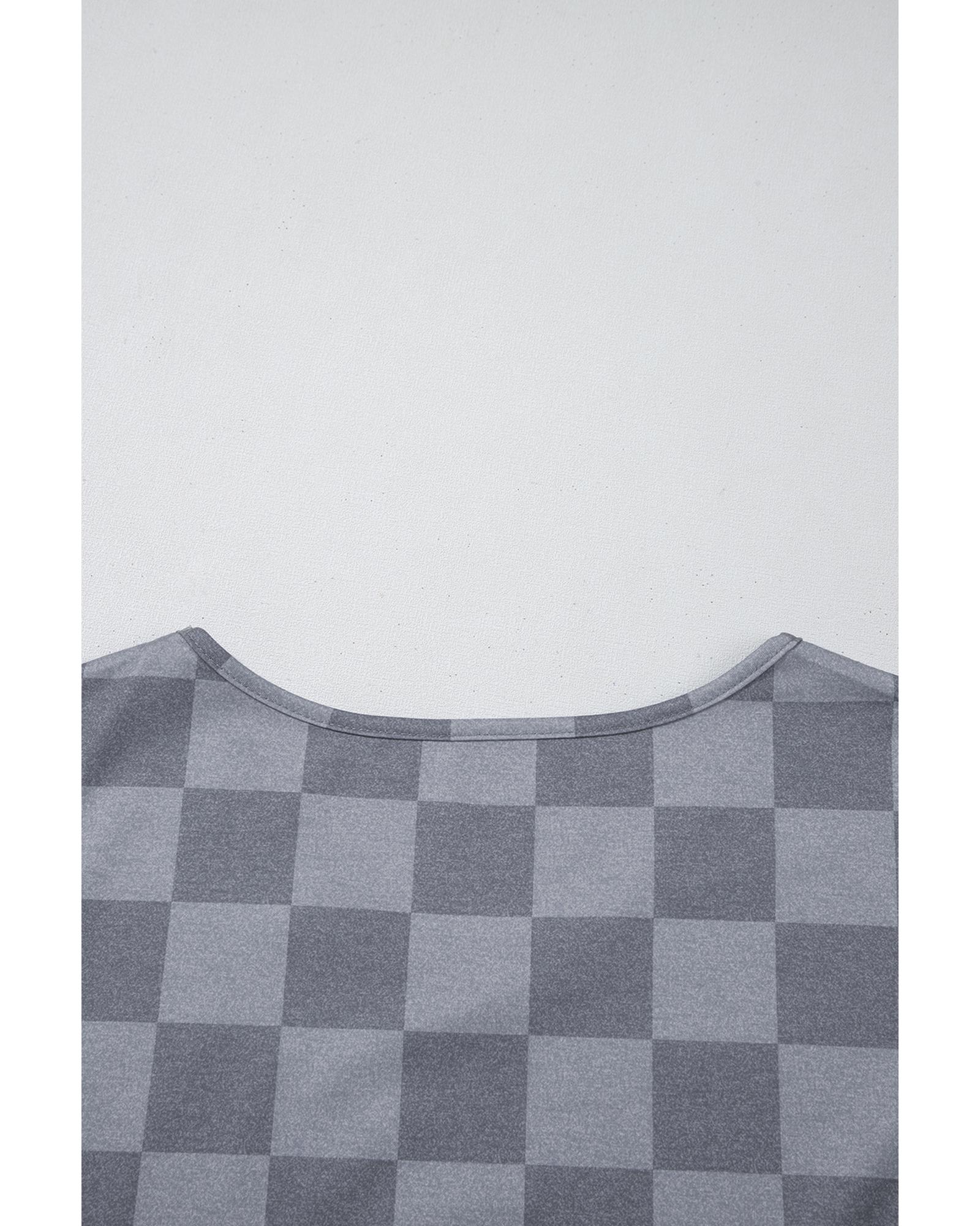 Gray Checkered V Neck Tee Drawstring Shorts Lounge Set – L