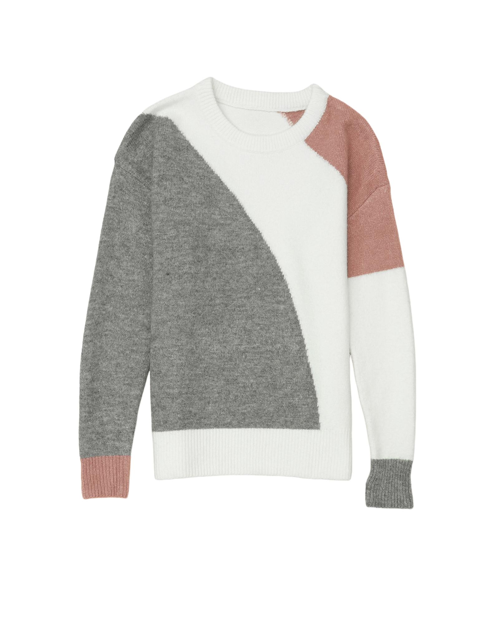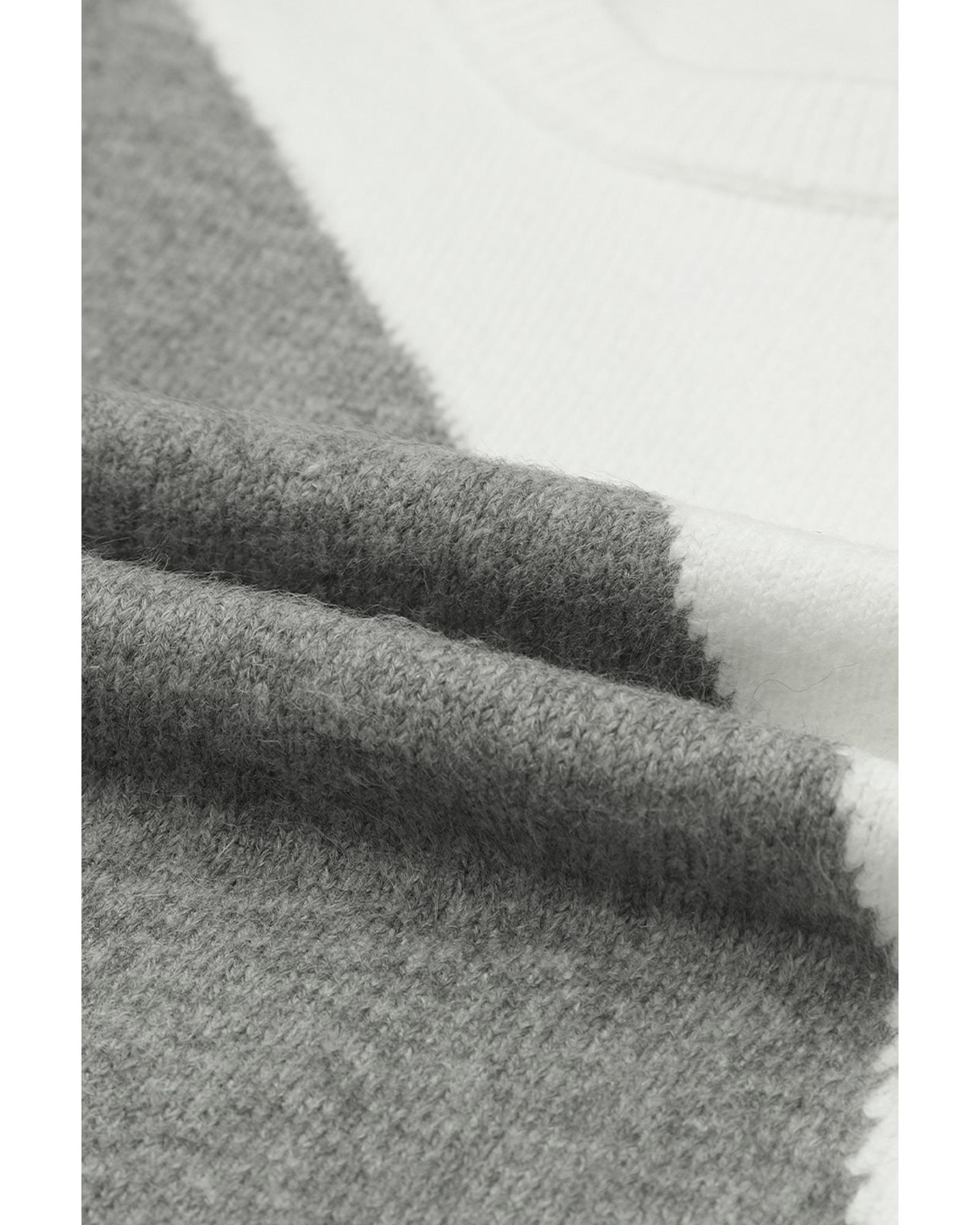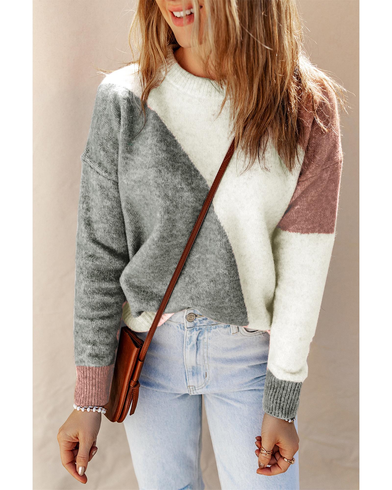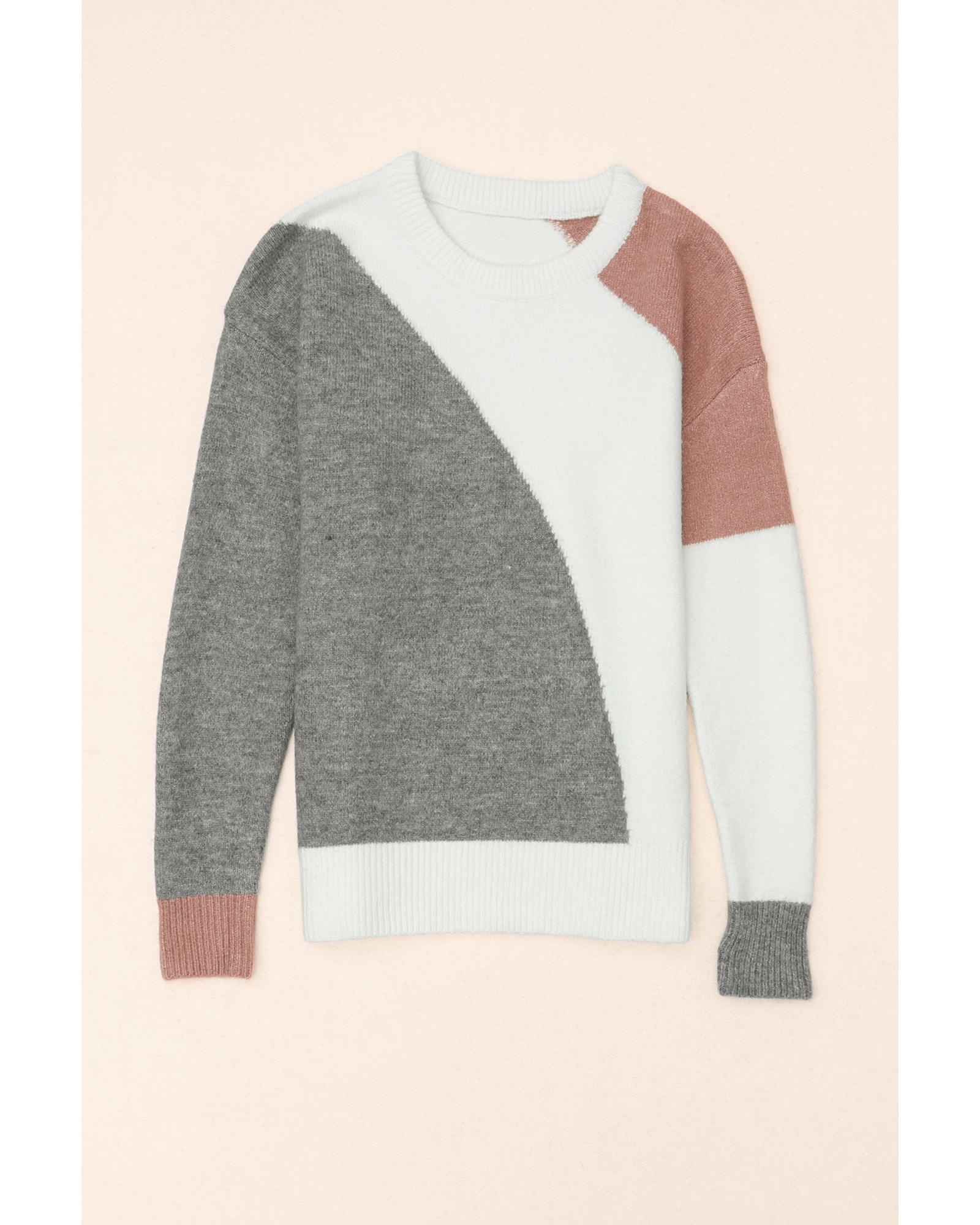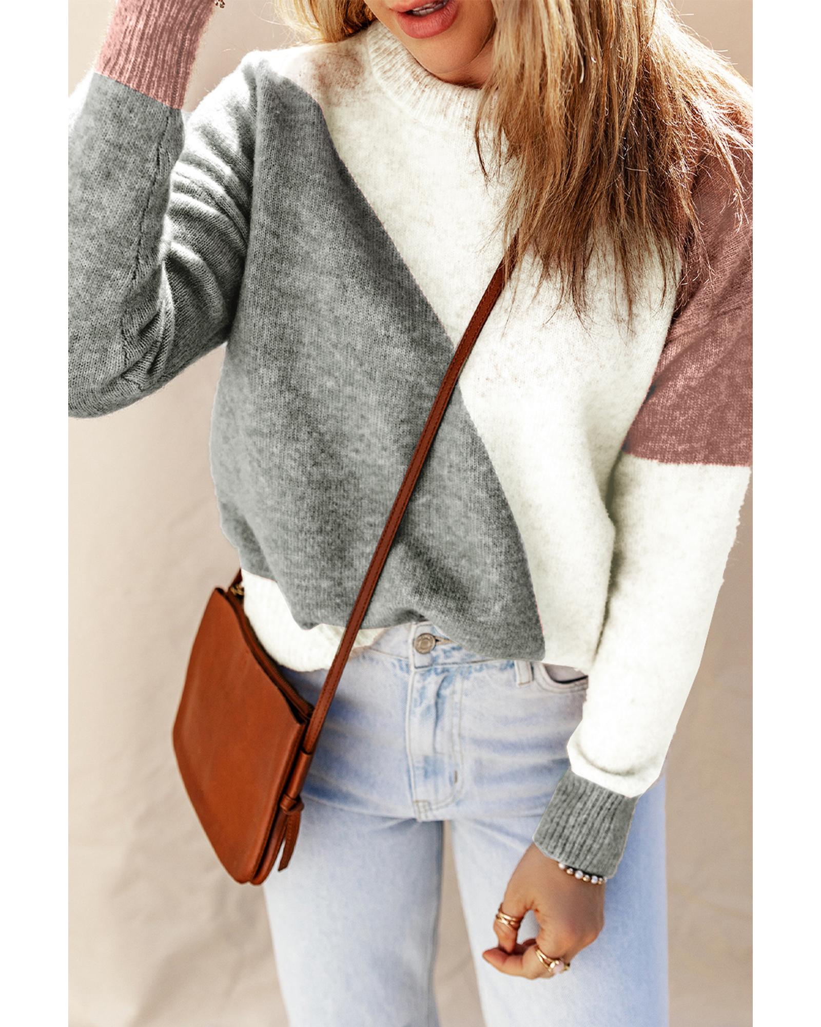 - Gray Colorblock Ribbed Trim Round Neck Sweater