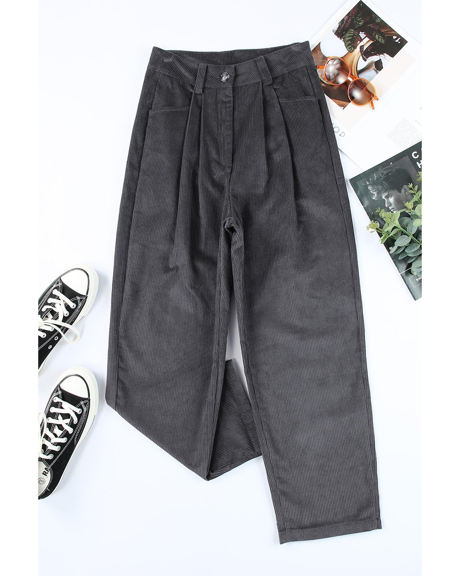 Gray corduroy pants suitable for cold winter days Features a zipper and button closure pockets high waist and solid color Great choice for leisure time shopping school home wear and casual daily wear Can be easily paired with t - shirts crop tops and casual shoes Available in a variety of sizes