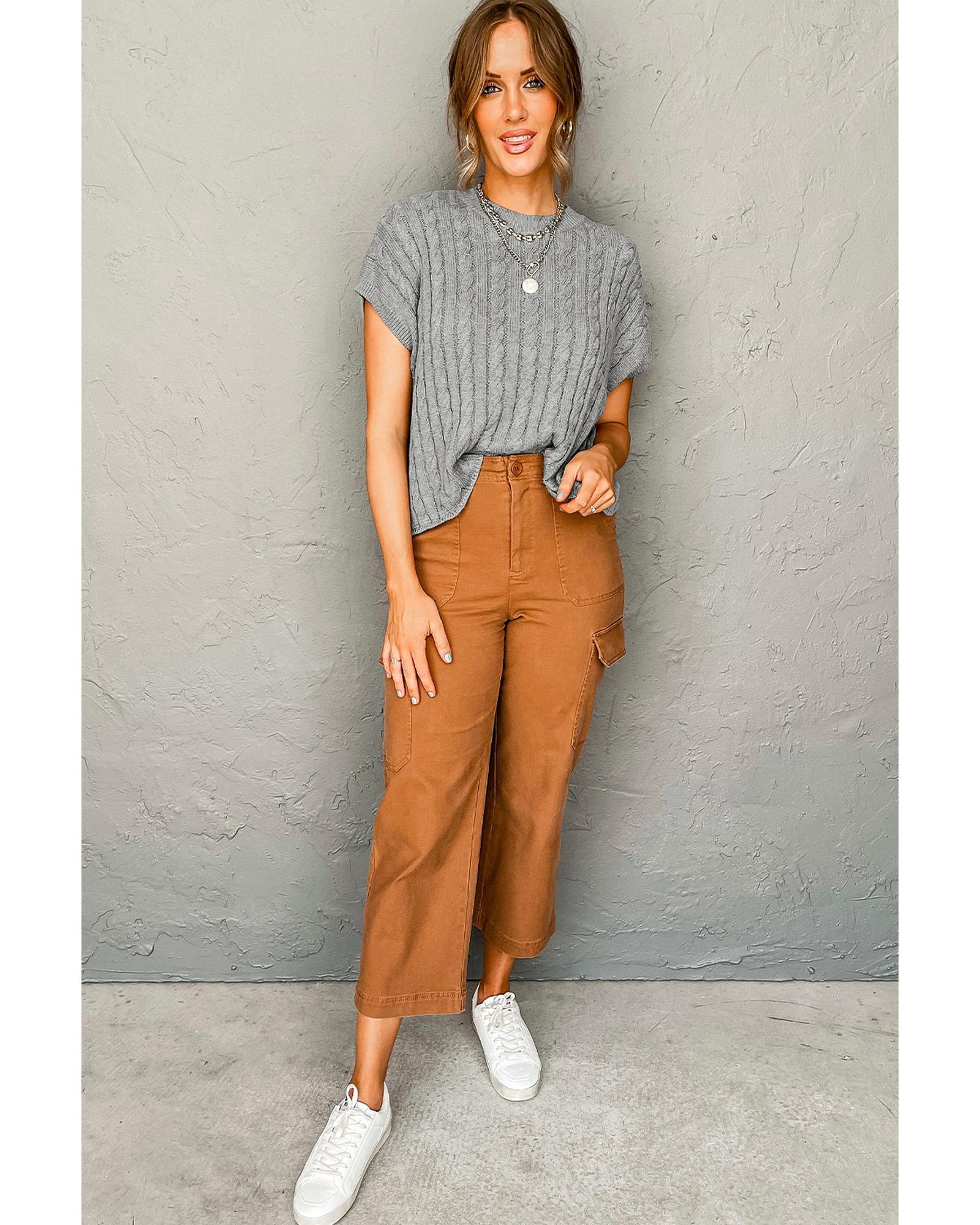 • Gray Crew Neck Cable Knit Short Sleeve Sweater
