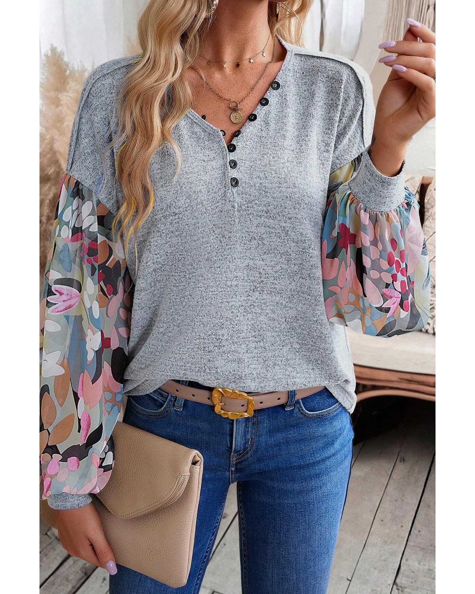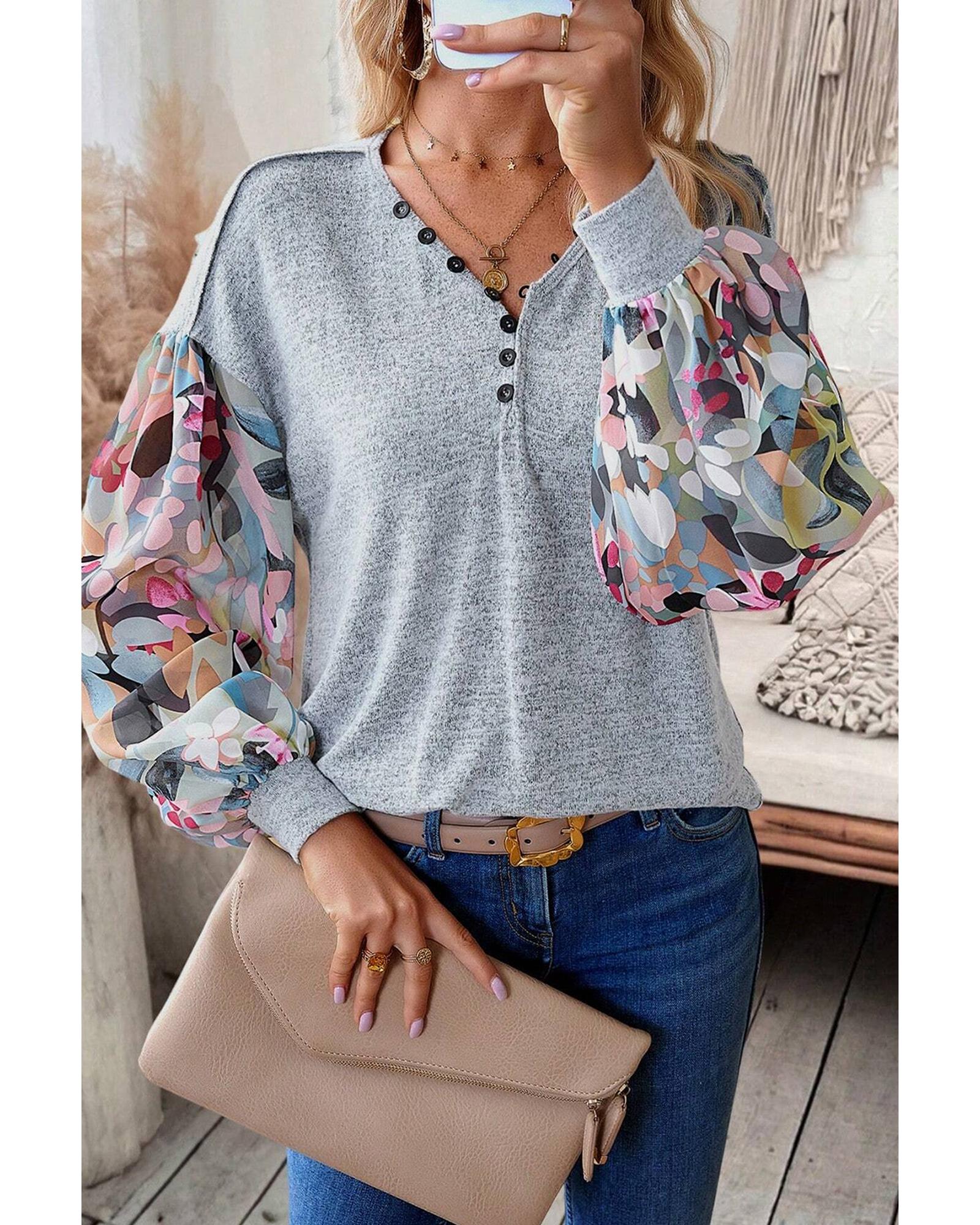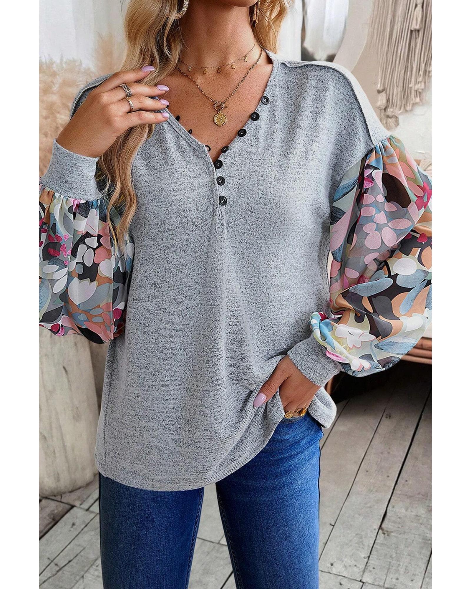 Gray Floral Lantern Sleeve Patchwork Buttoned V Neck Top – M