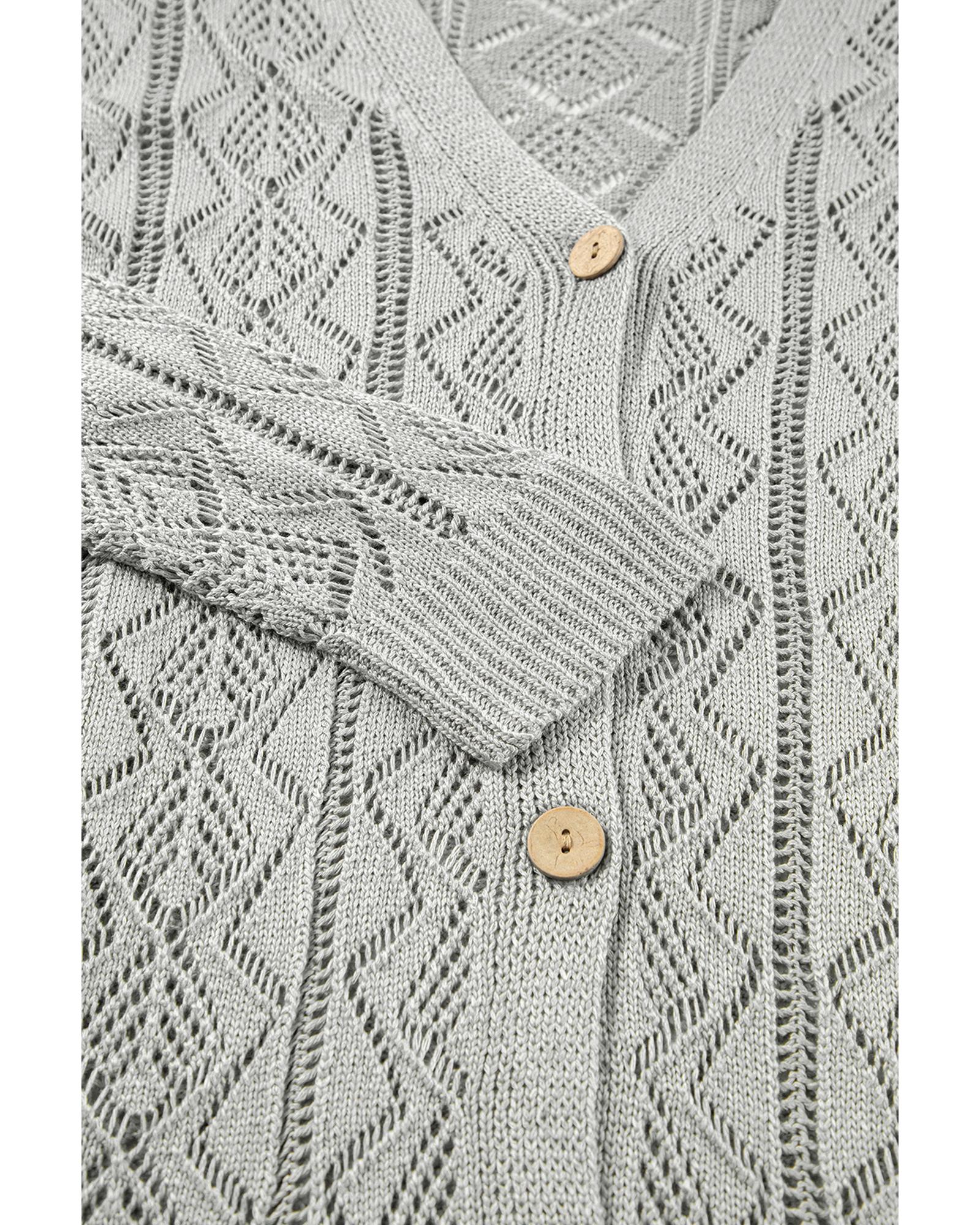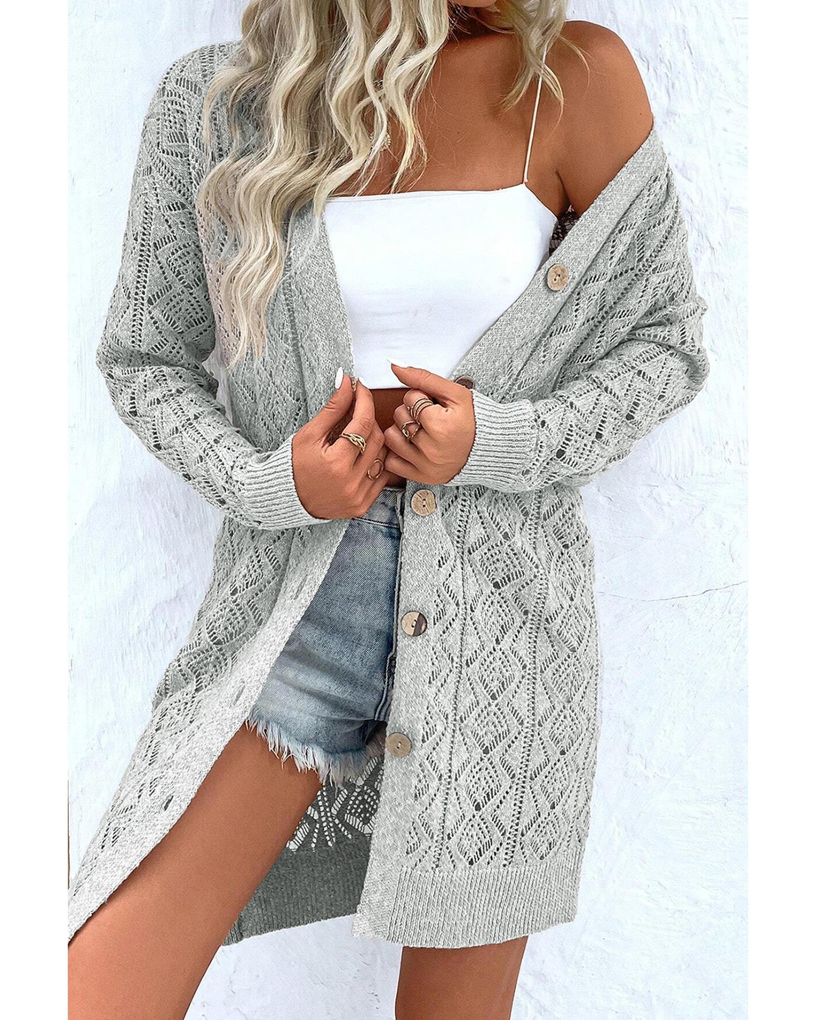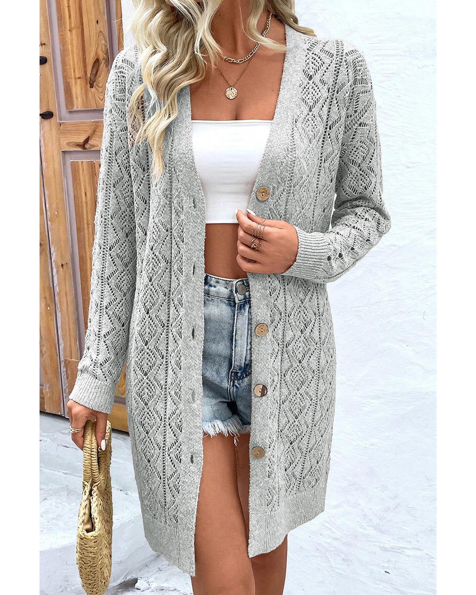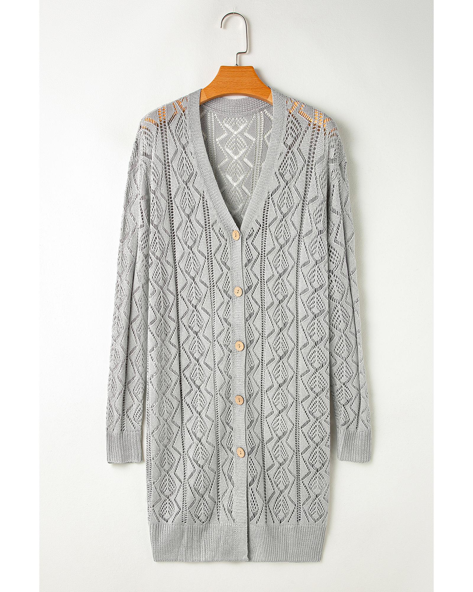 Gray Hollow Out Buttons Front Long Cardigan – L