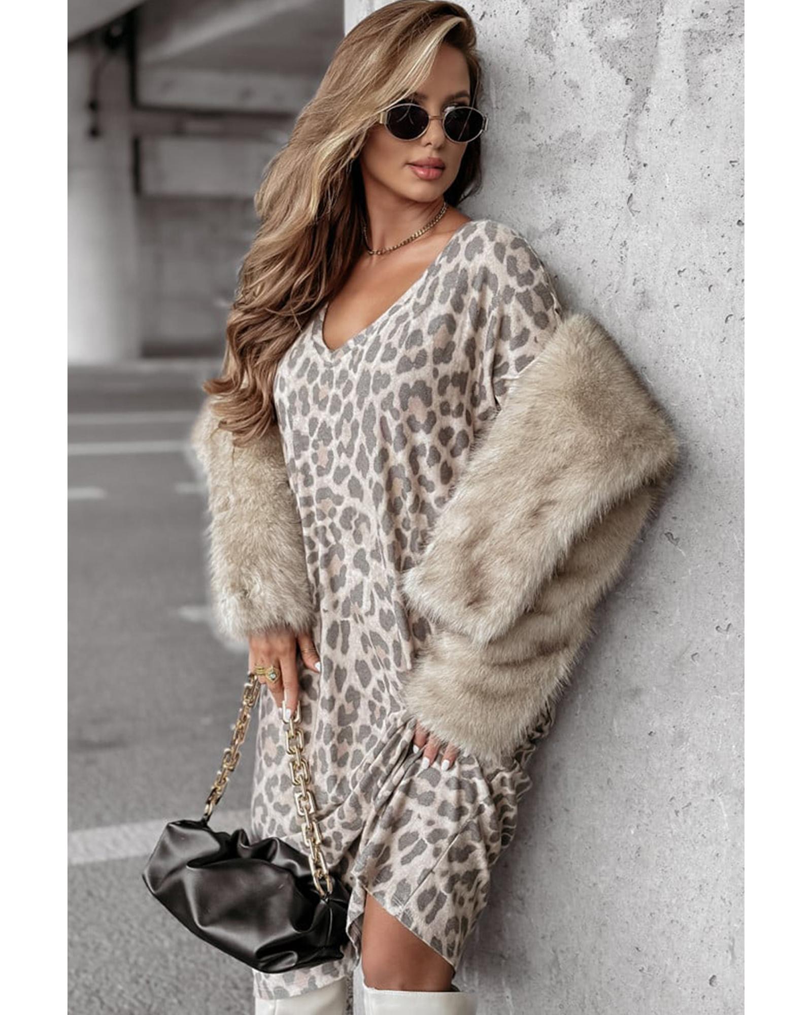 Gray Leopard Print V Neck Loose Fit Mini Dress - S Original price was: $57.99.Current price is: $30.99.