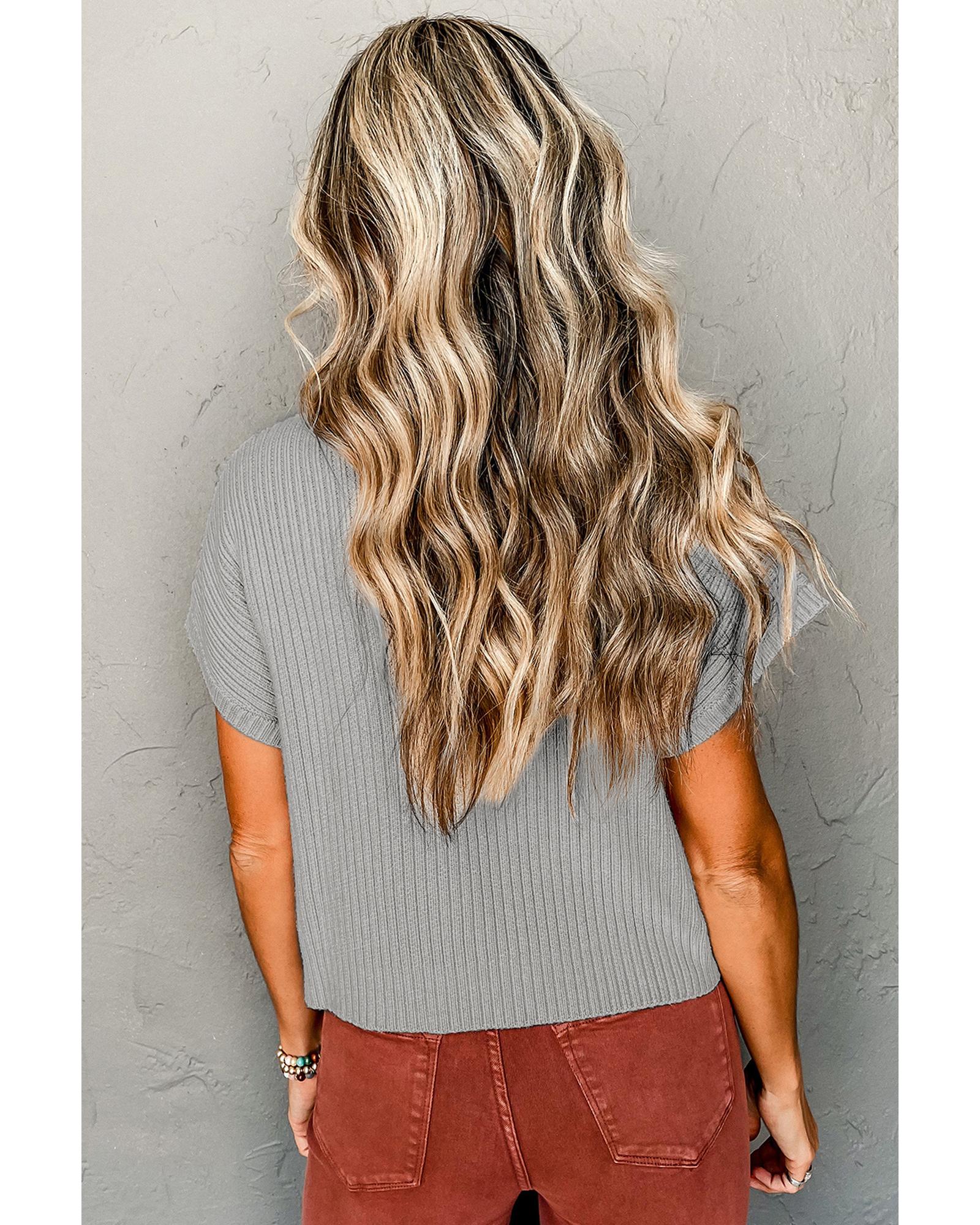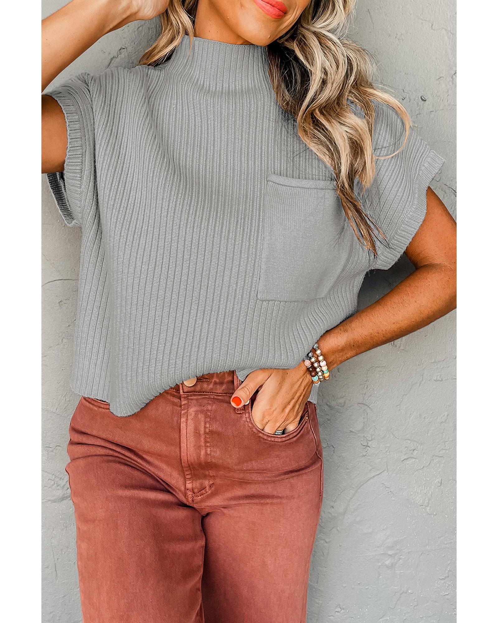 Gray Patch Pocket Ribbed Knit Short Sleeve Sweater – S