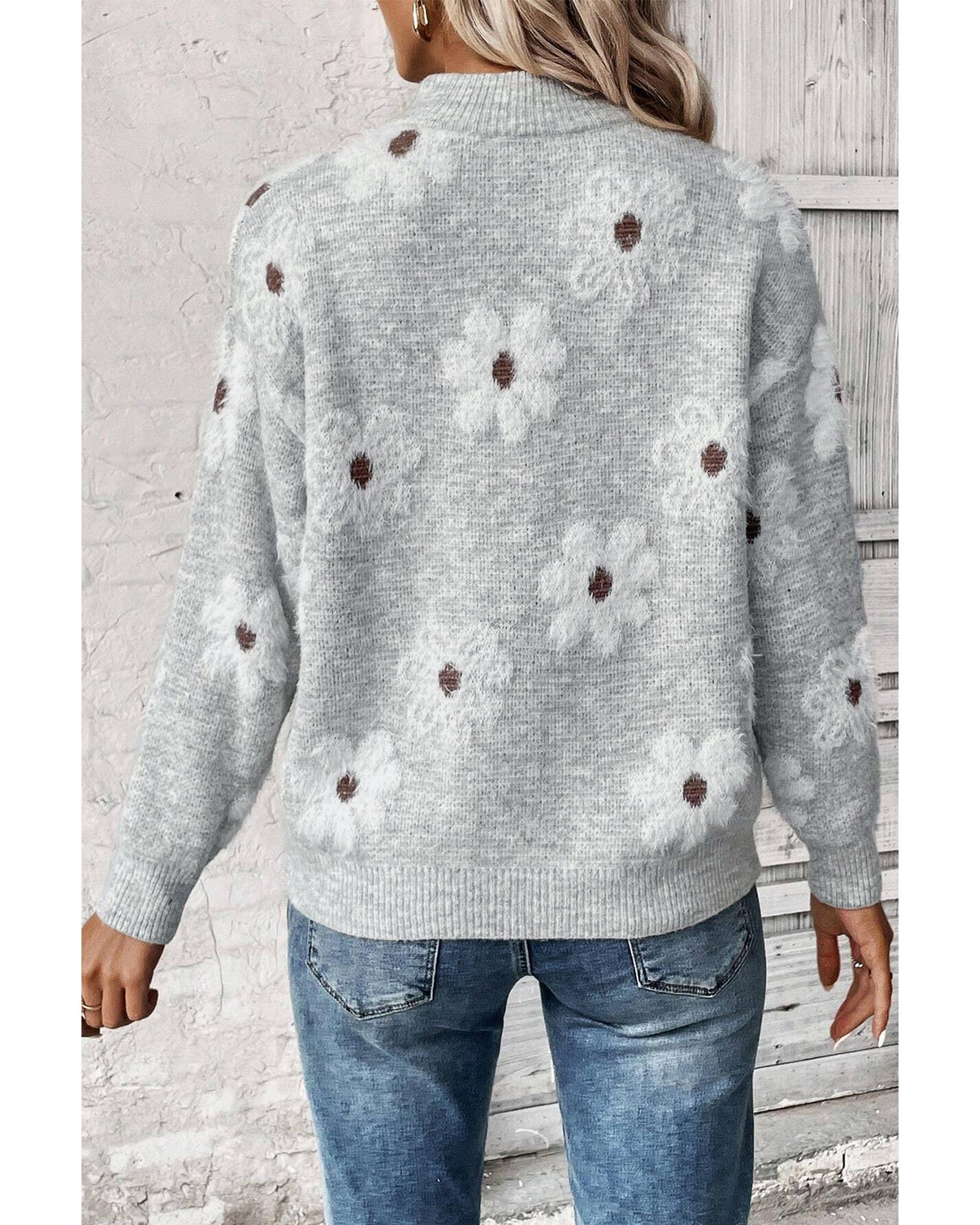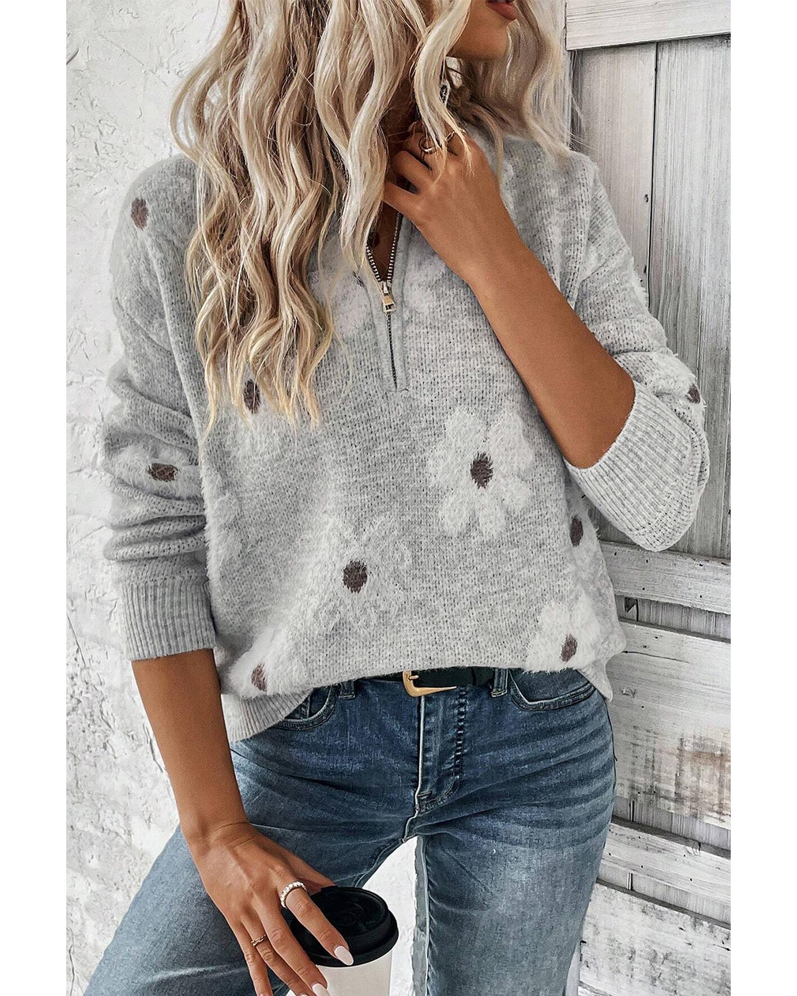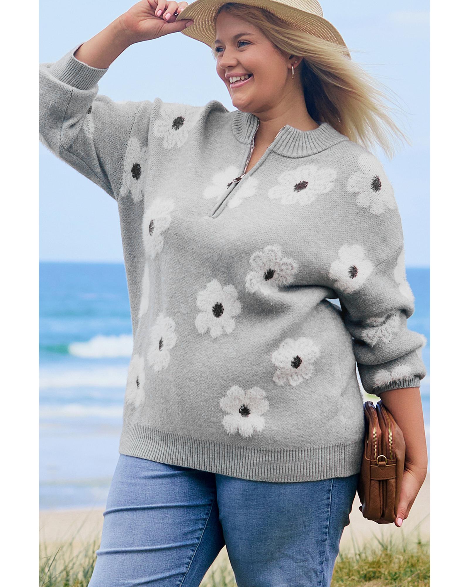 Gray Plus Size Embroidered Floral Pattern Half Zip Sweater – 2X