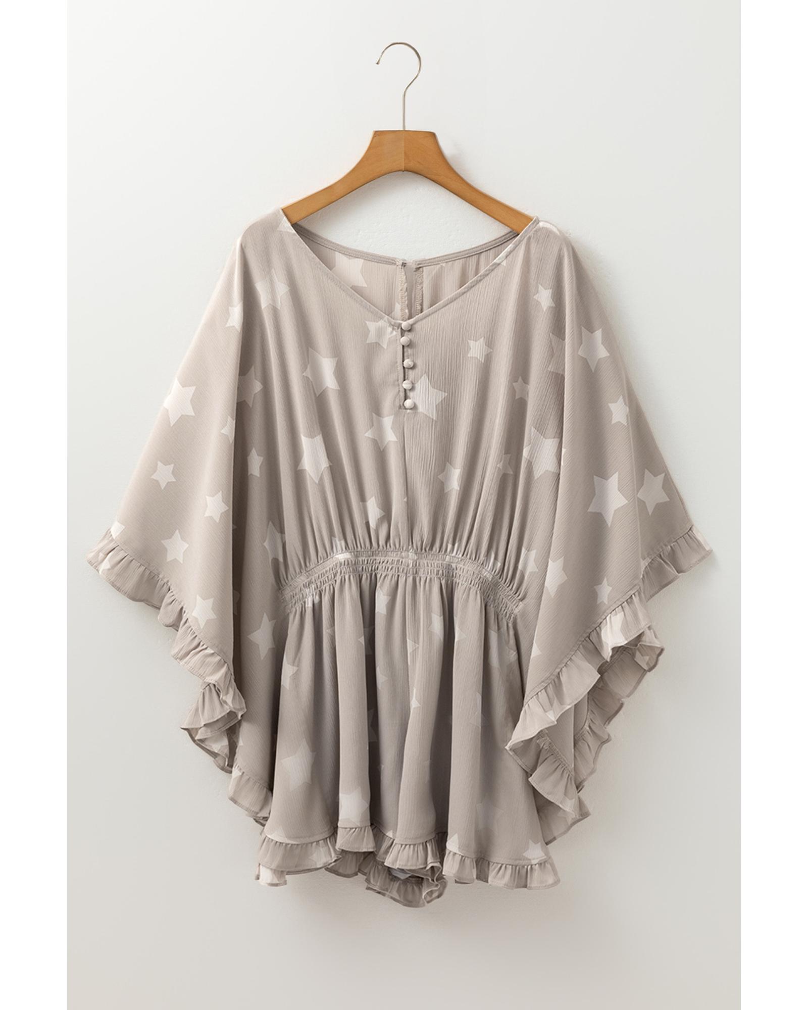 Gray Star Print Crinkle Textured Kimono Ruffle Sleeve Romper – L