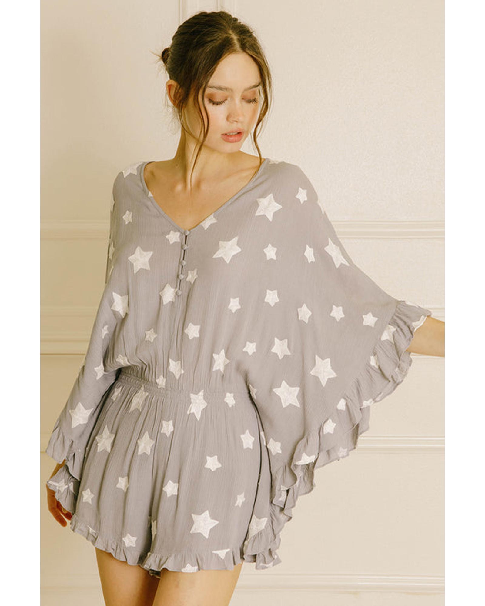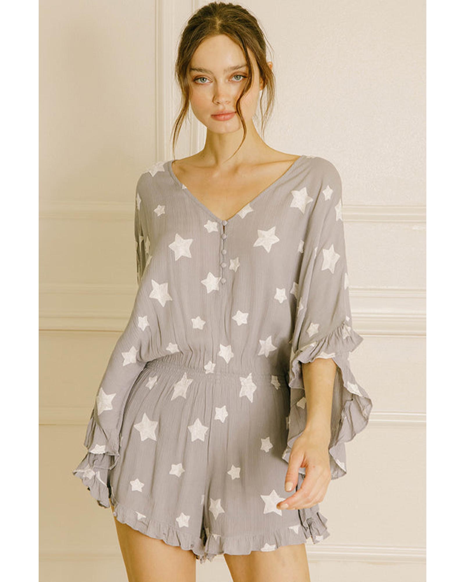 Gray Star Print Crinkle Textured Kimono Ruffle Sleeve Romper – M