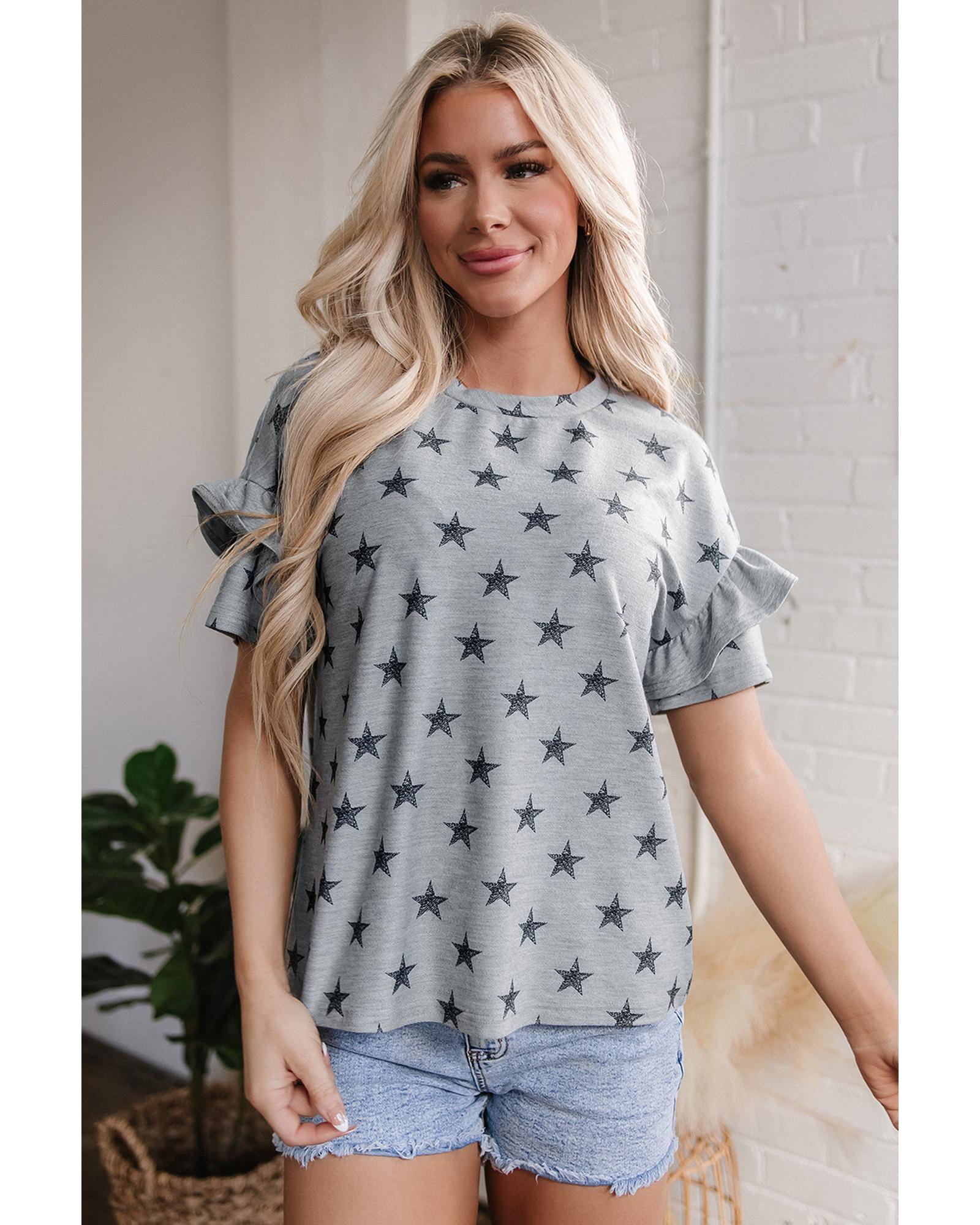 Gray Star Print Tiered Ruffled Sleeve Crew Neck T Shirt – S