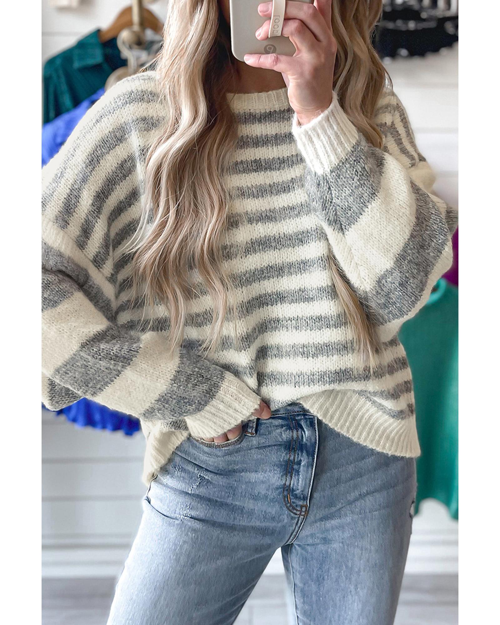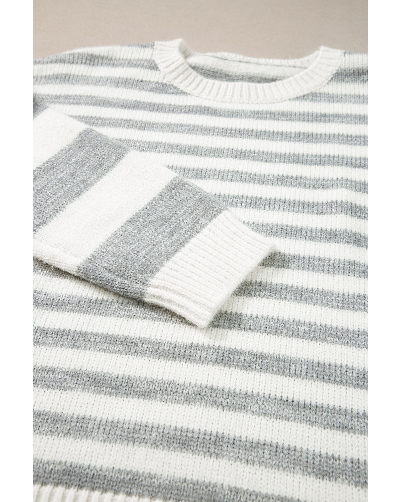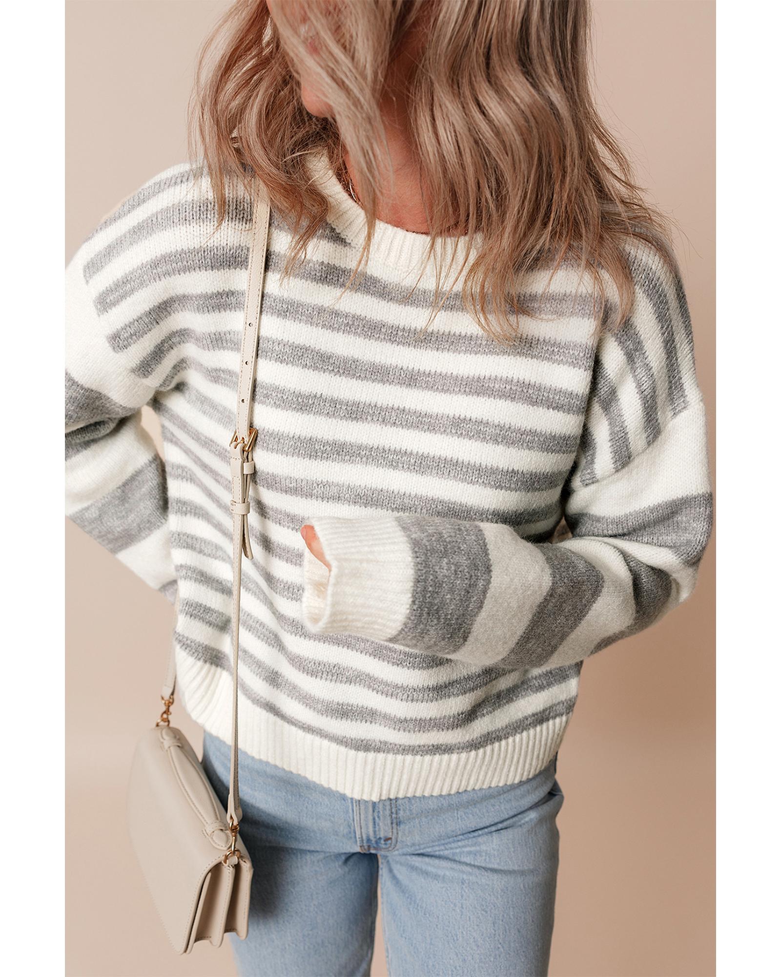 - Gray Stripe Drop Shoulder Crew Neck Sweater