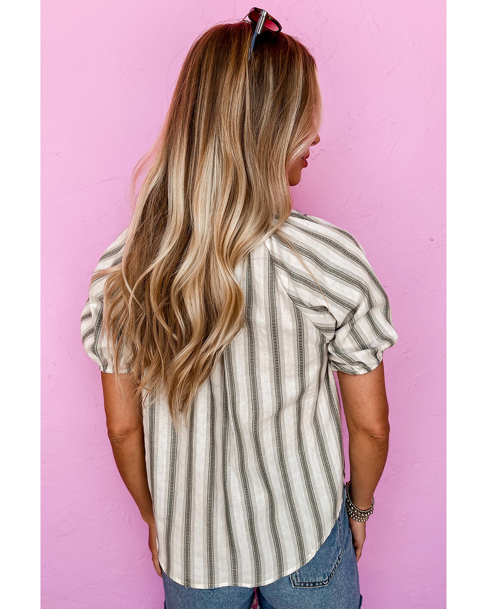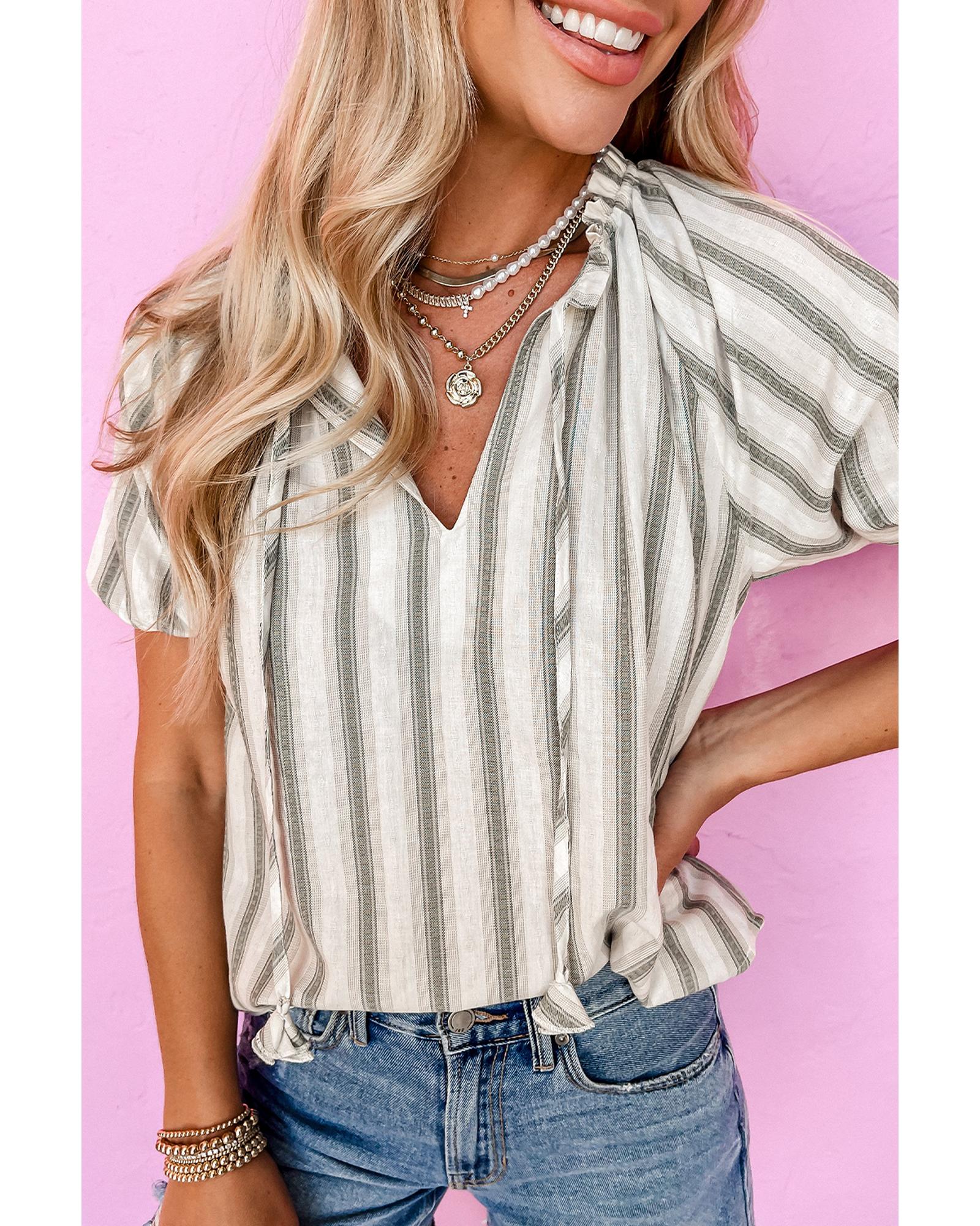 - Gray stripe frilled tie neck short sleeve blouse