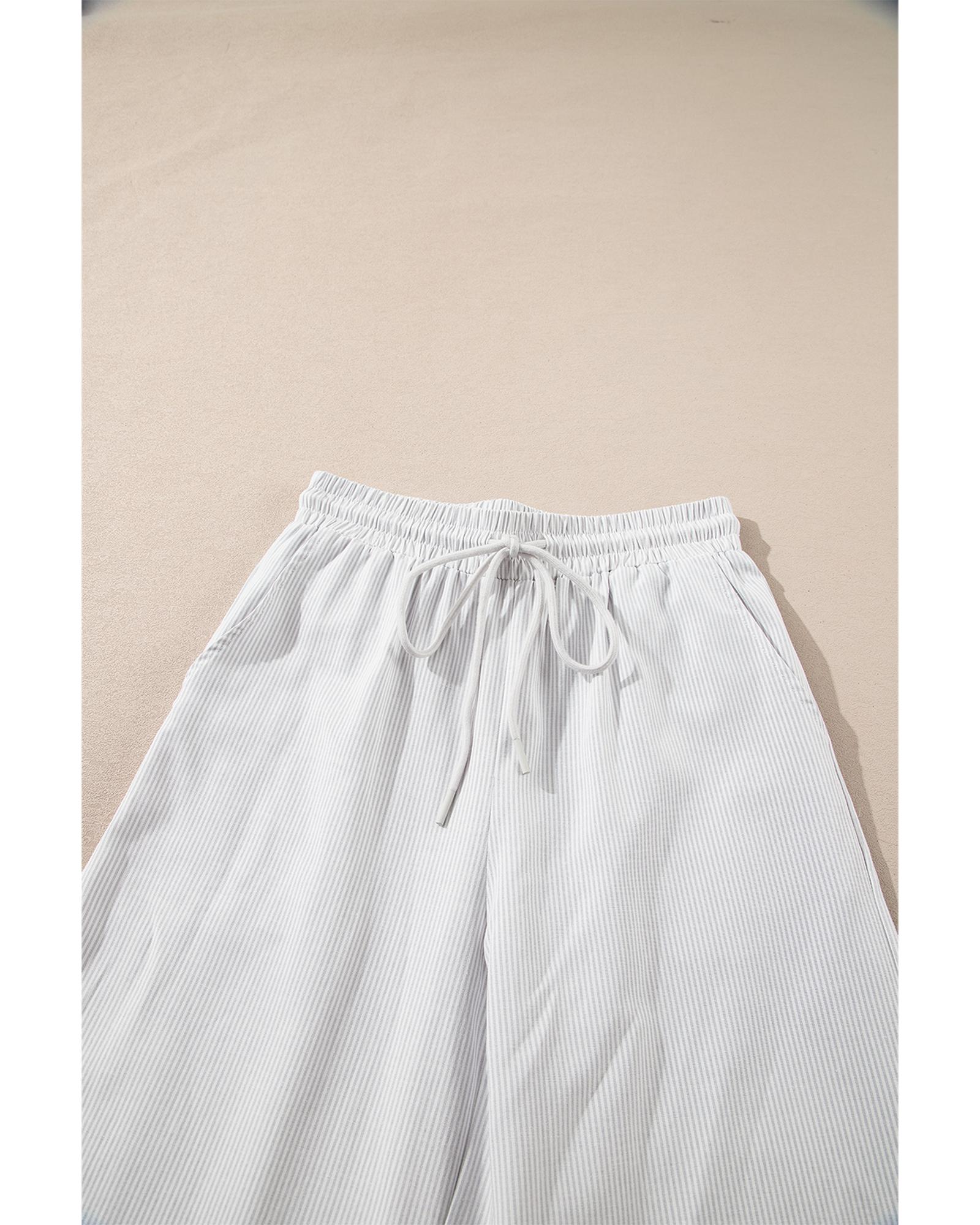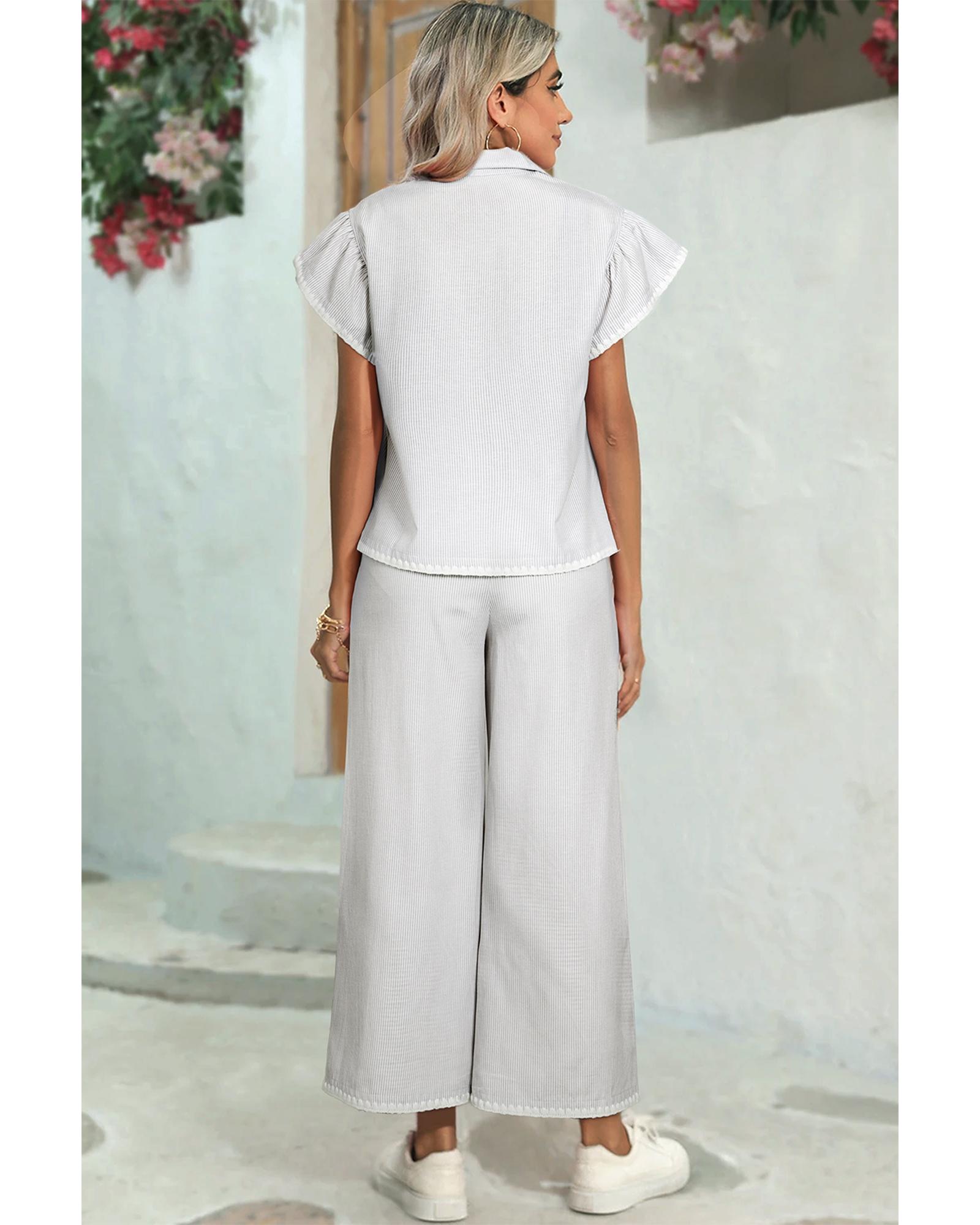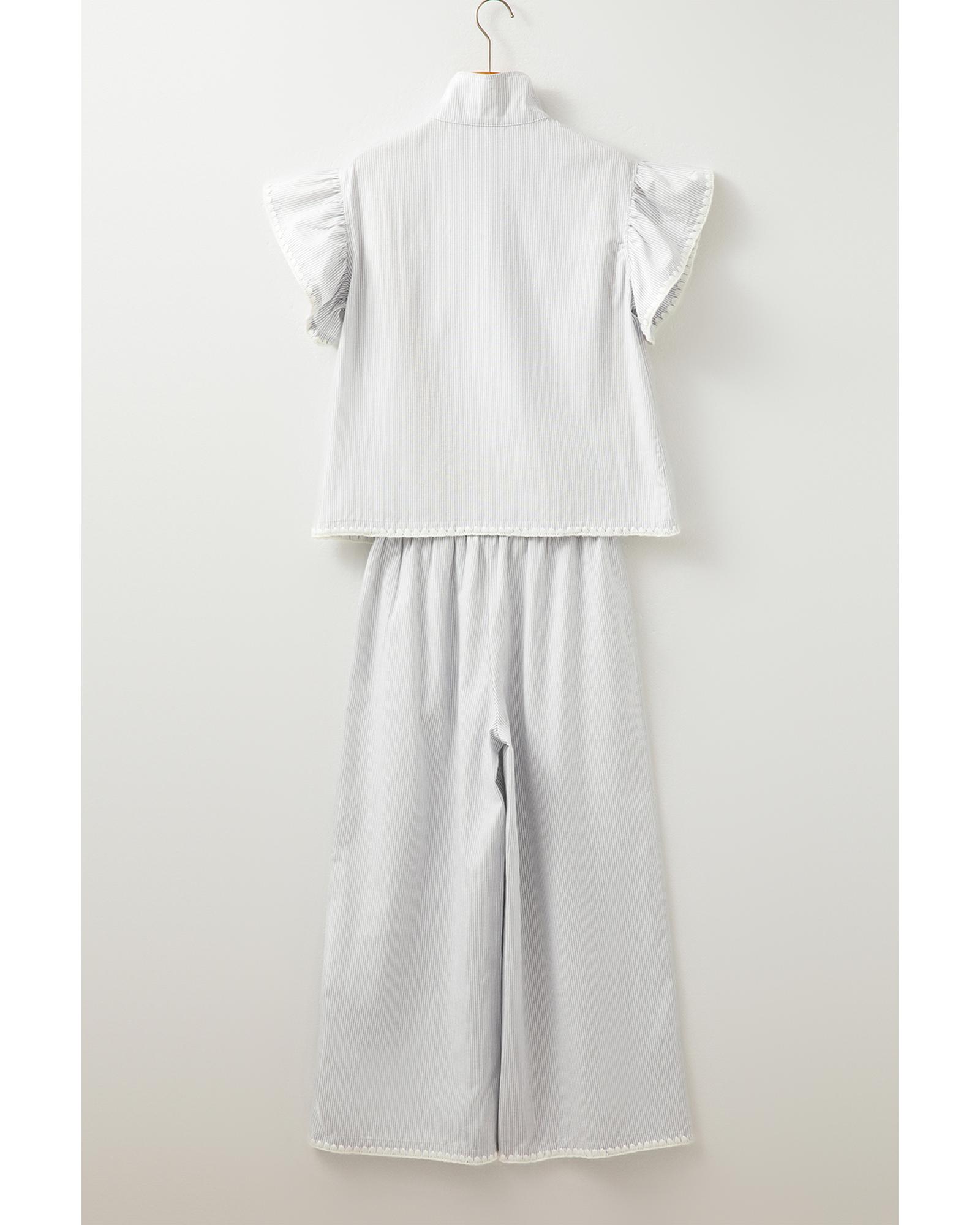 Gray Stripe Zipped up Collar Ruffled Sleeve Tee and Wide Leg Pants 2pcs Outfit – L