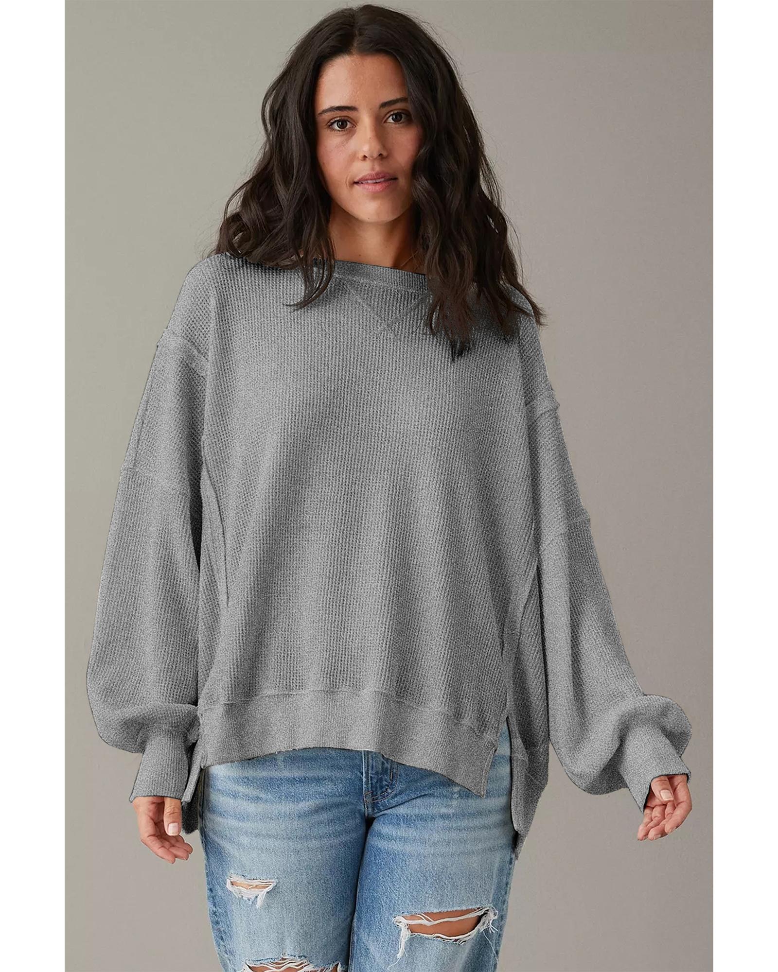 Gray Waffle knit Bishop Sleeve Split Oversized Top – L