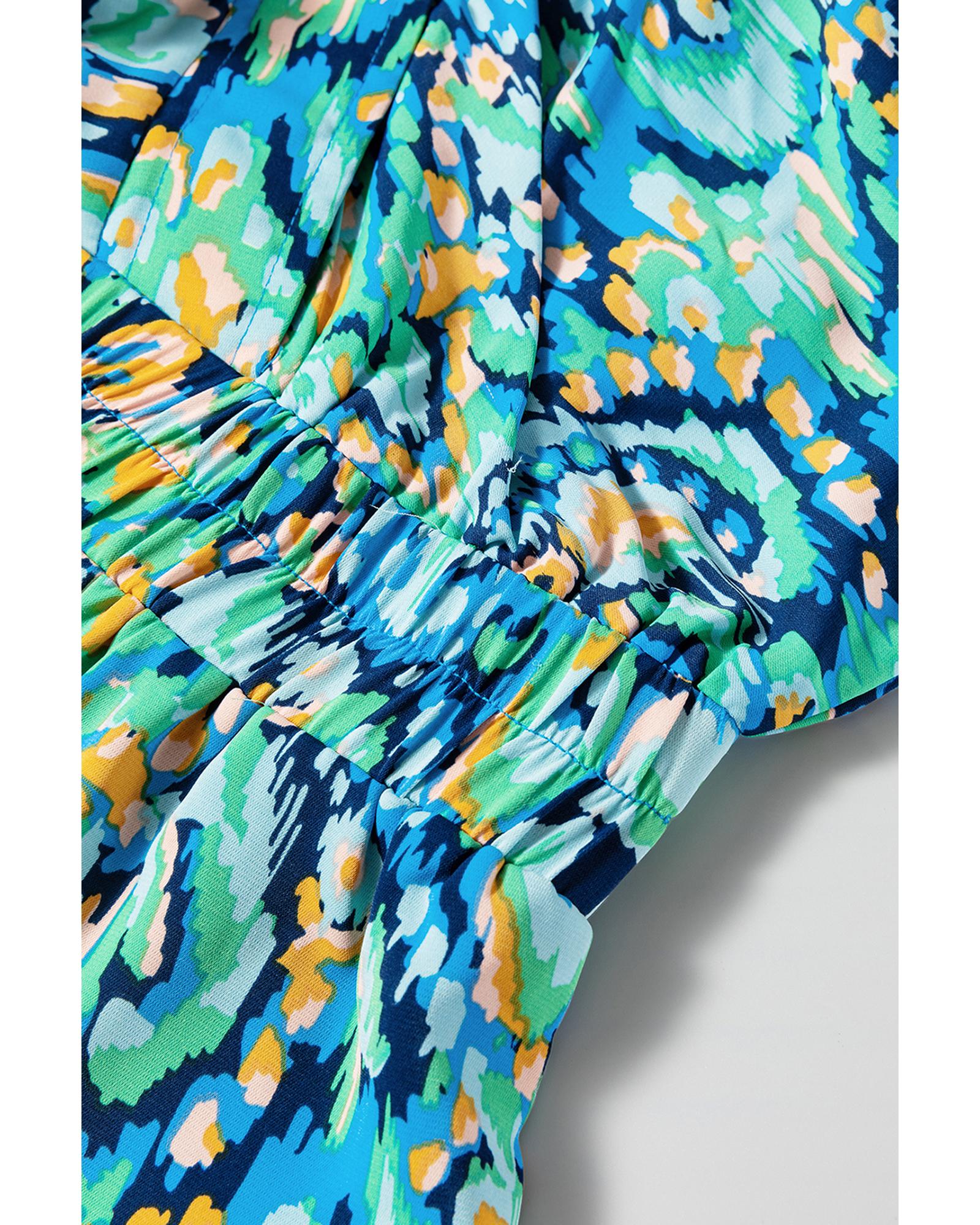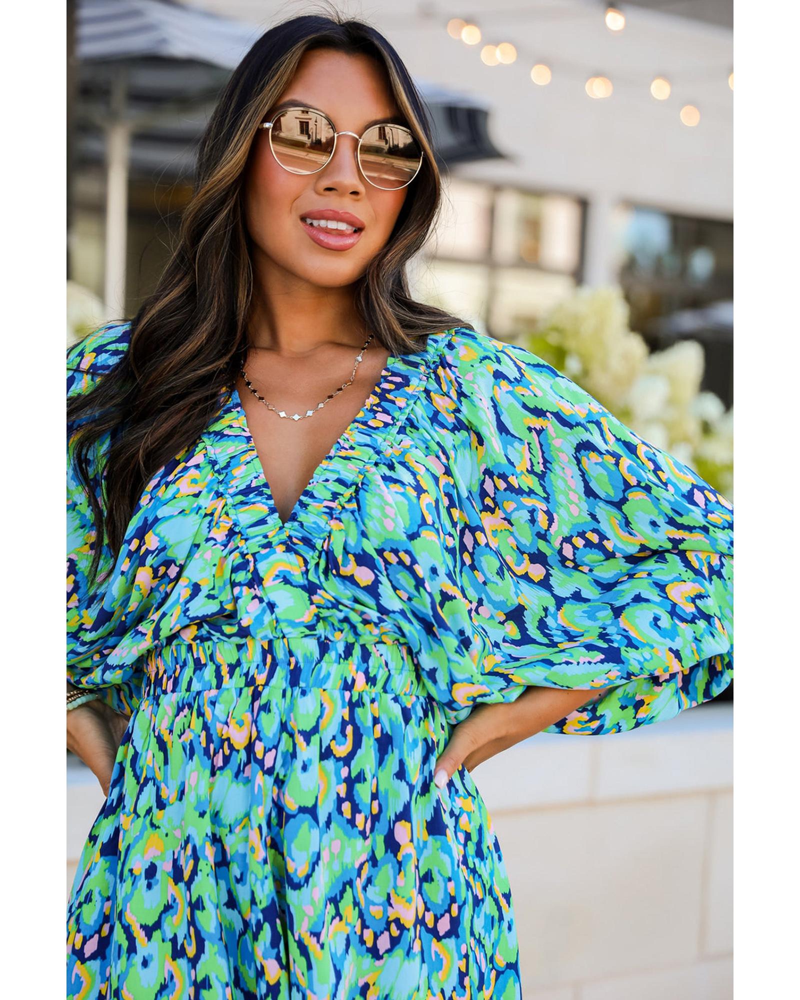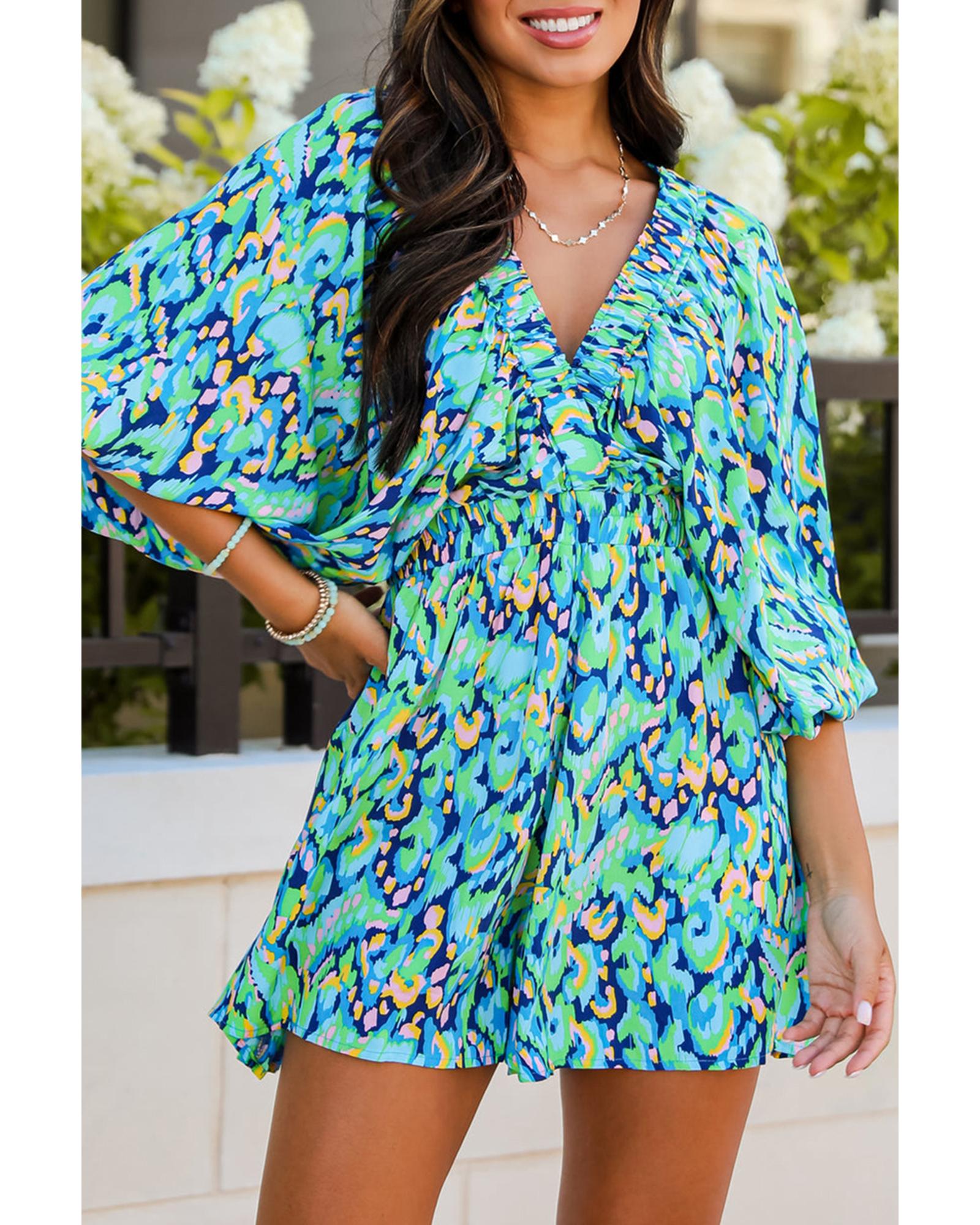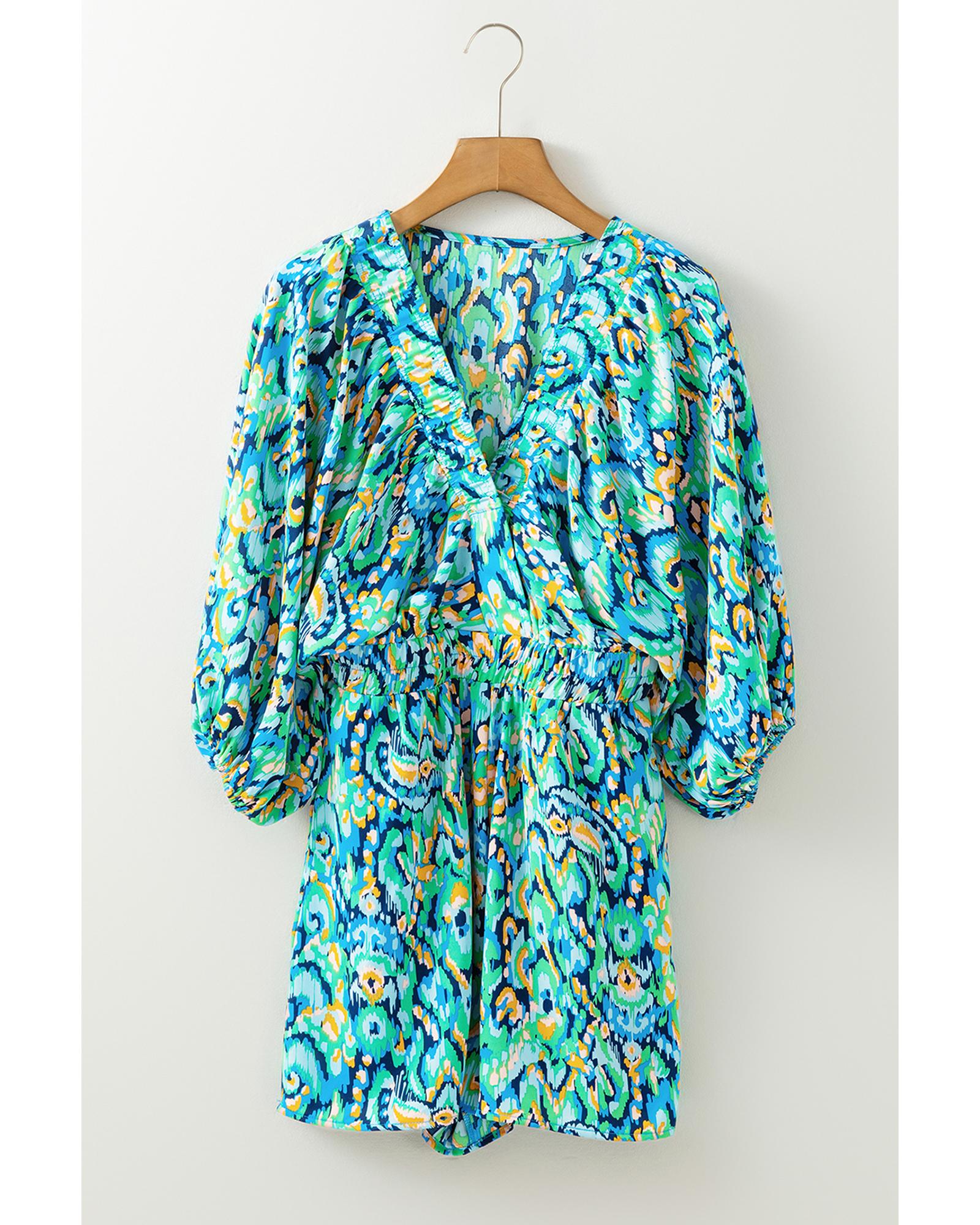Green Abstract Print Puff Sleeve V Neck High Waist Romper – M