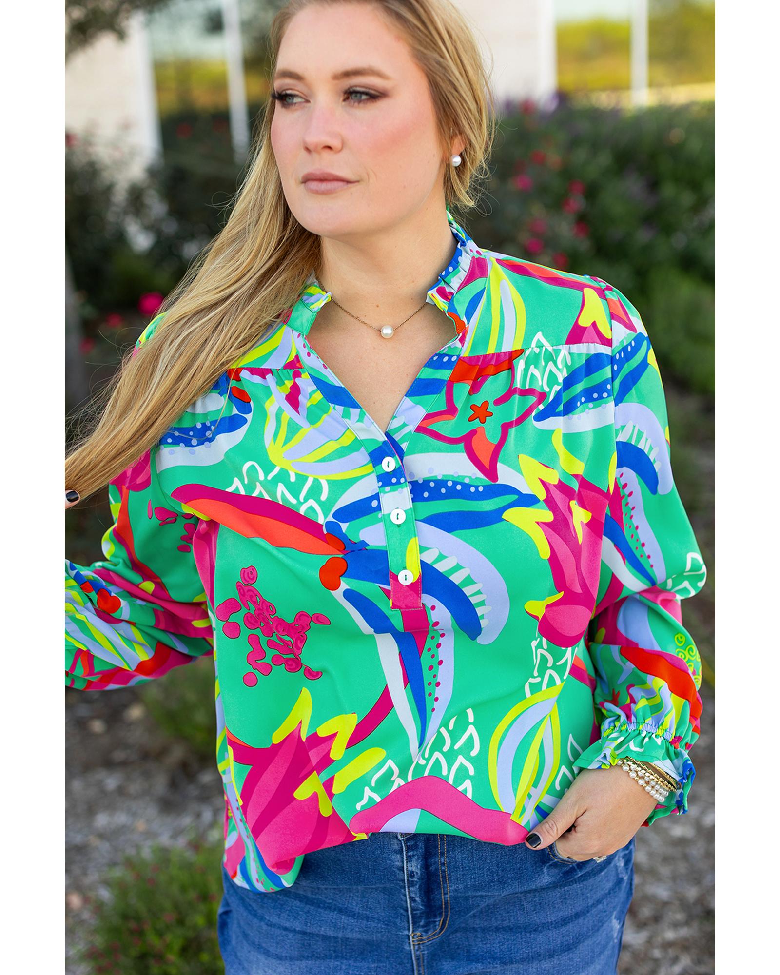 Green Abstract Printed Flounce Sleeve V Neck Buttoned Plus Size Blouse – 3X