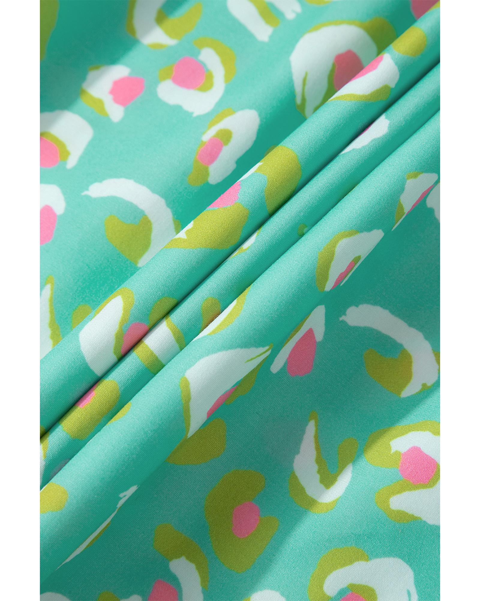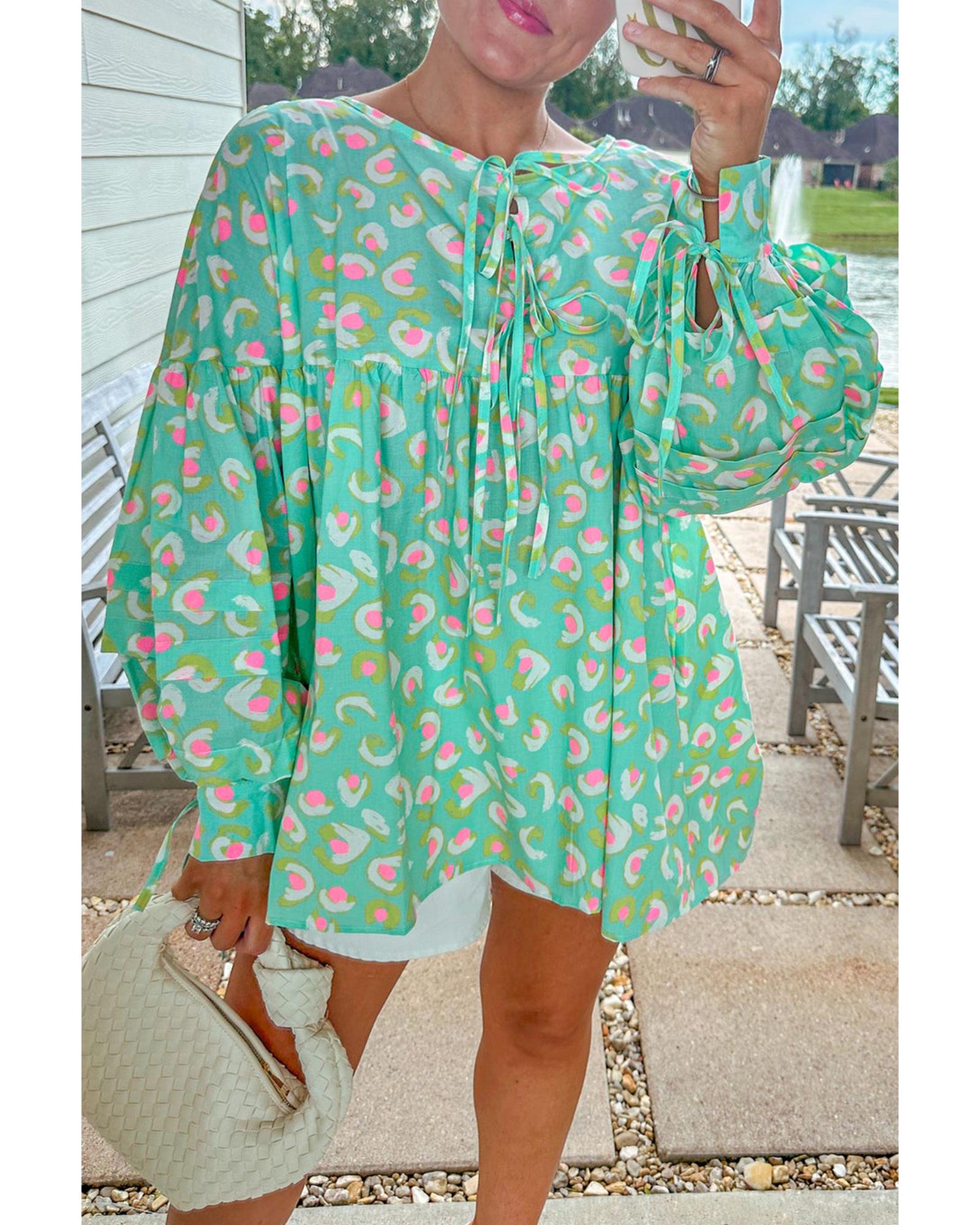 Green Abstract Printed Lace-up Lantern Sleeve Babydoll Blouse – L