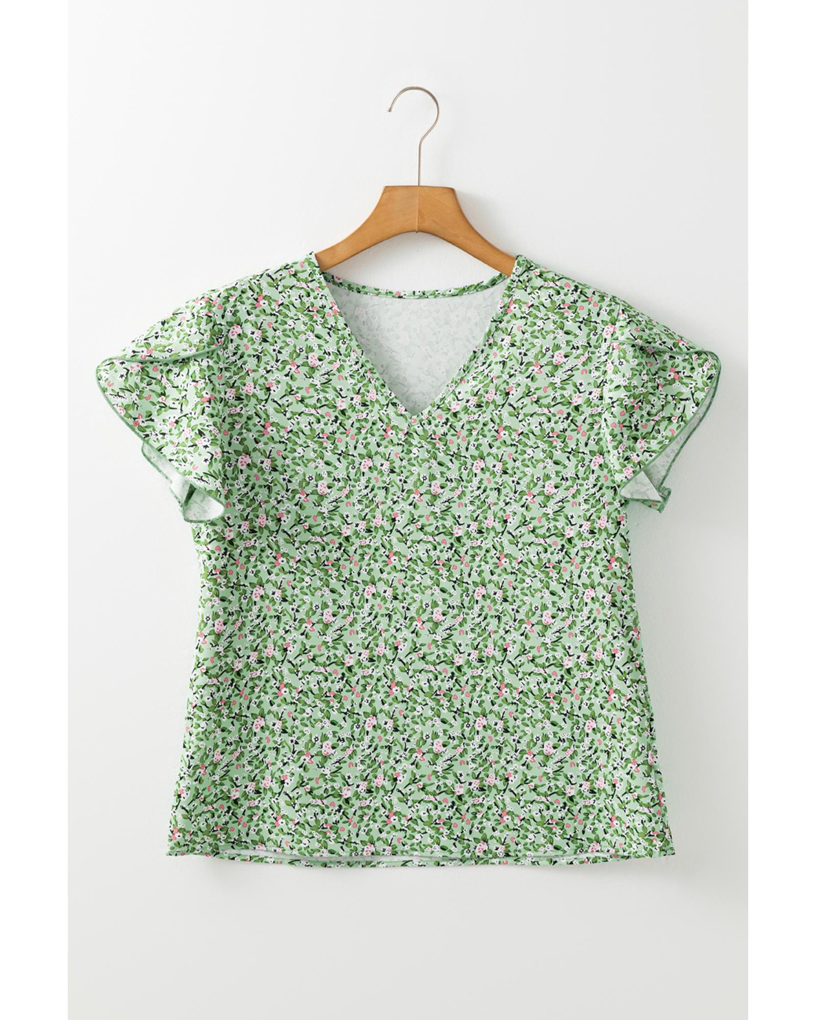 Green Boho Floral V Neck Wrap Short Sleeve Blouse – M