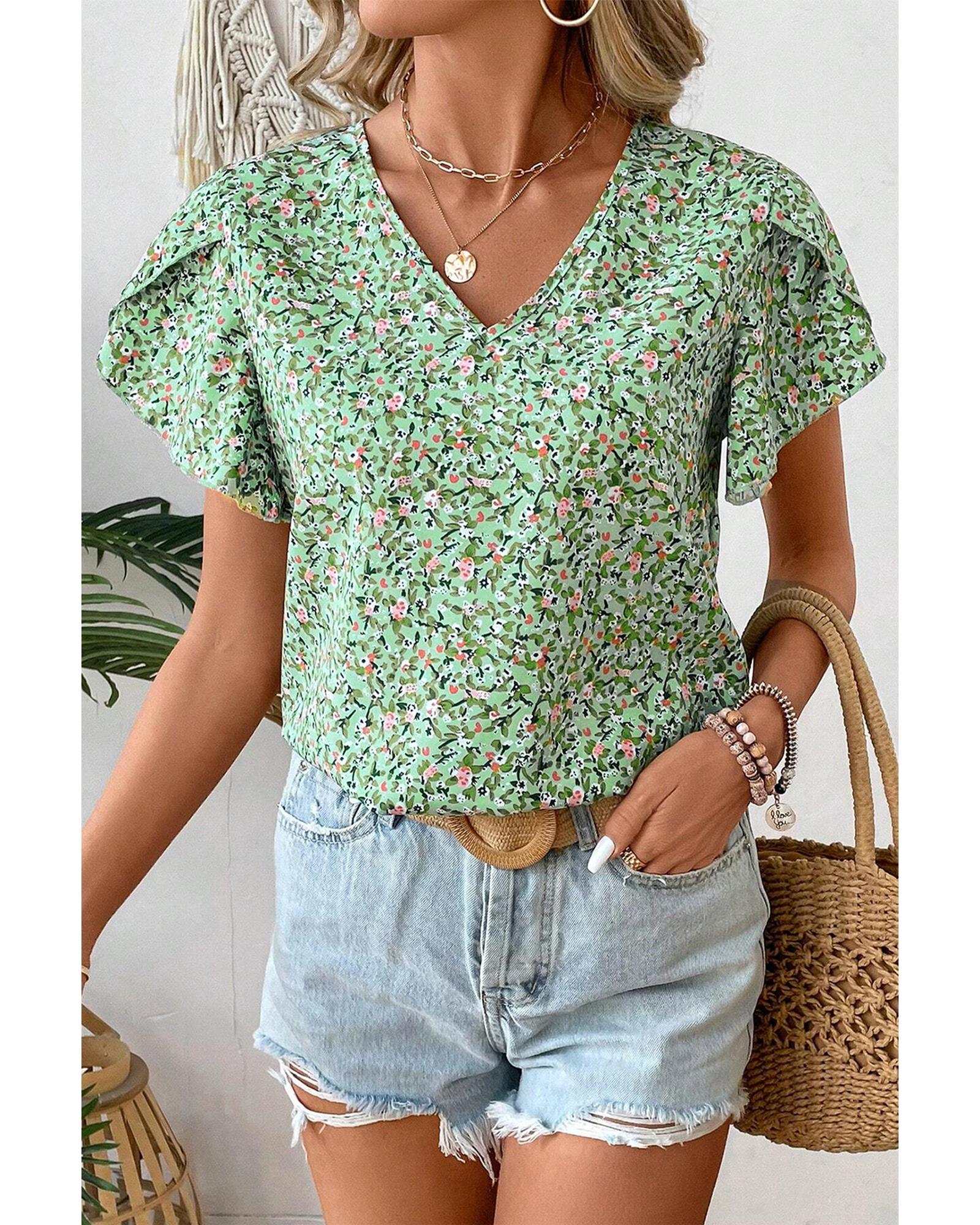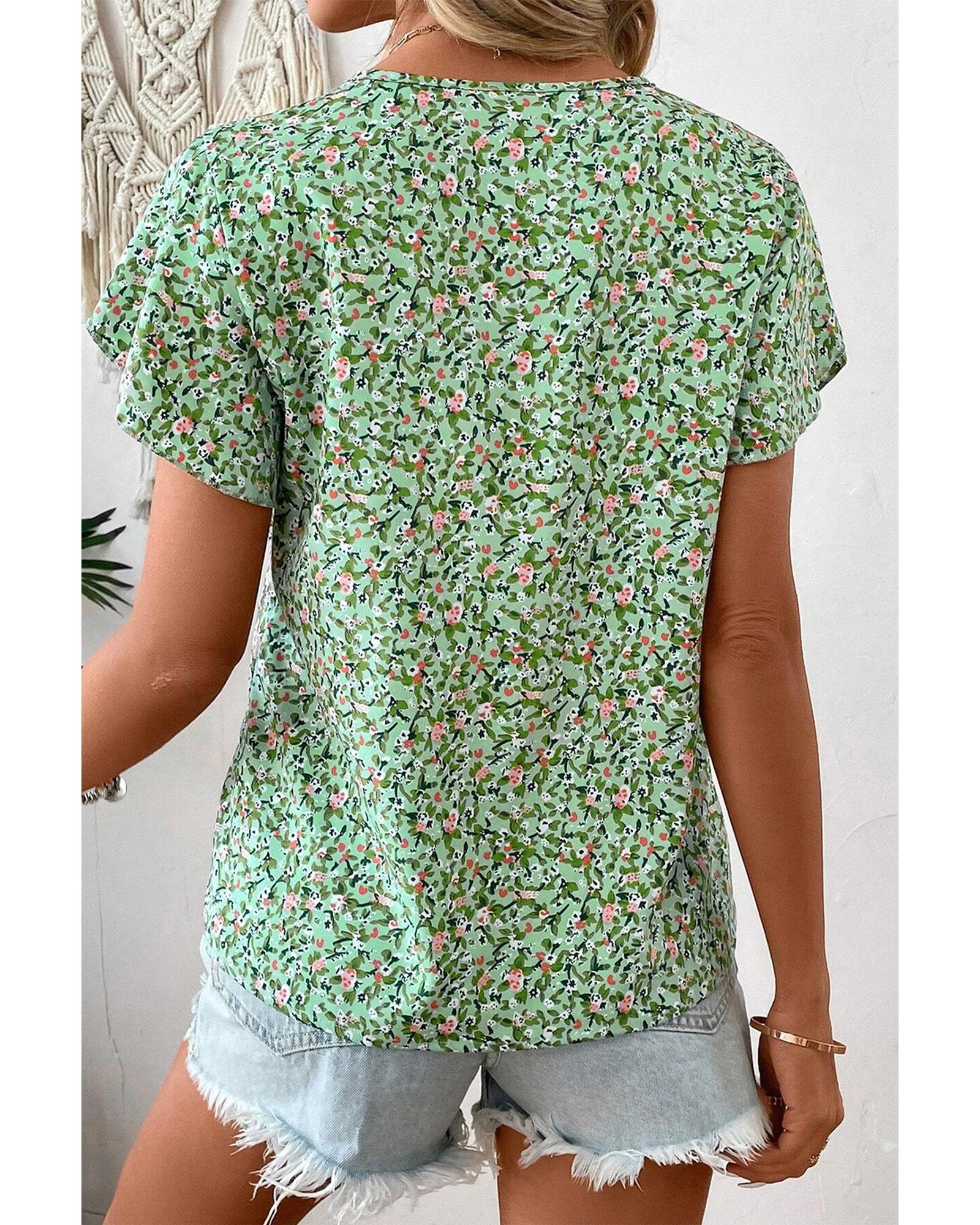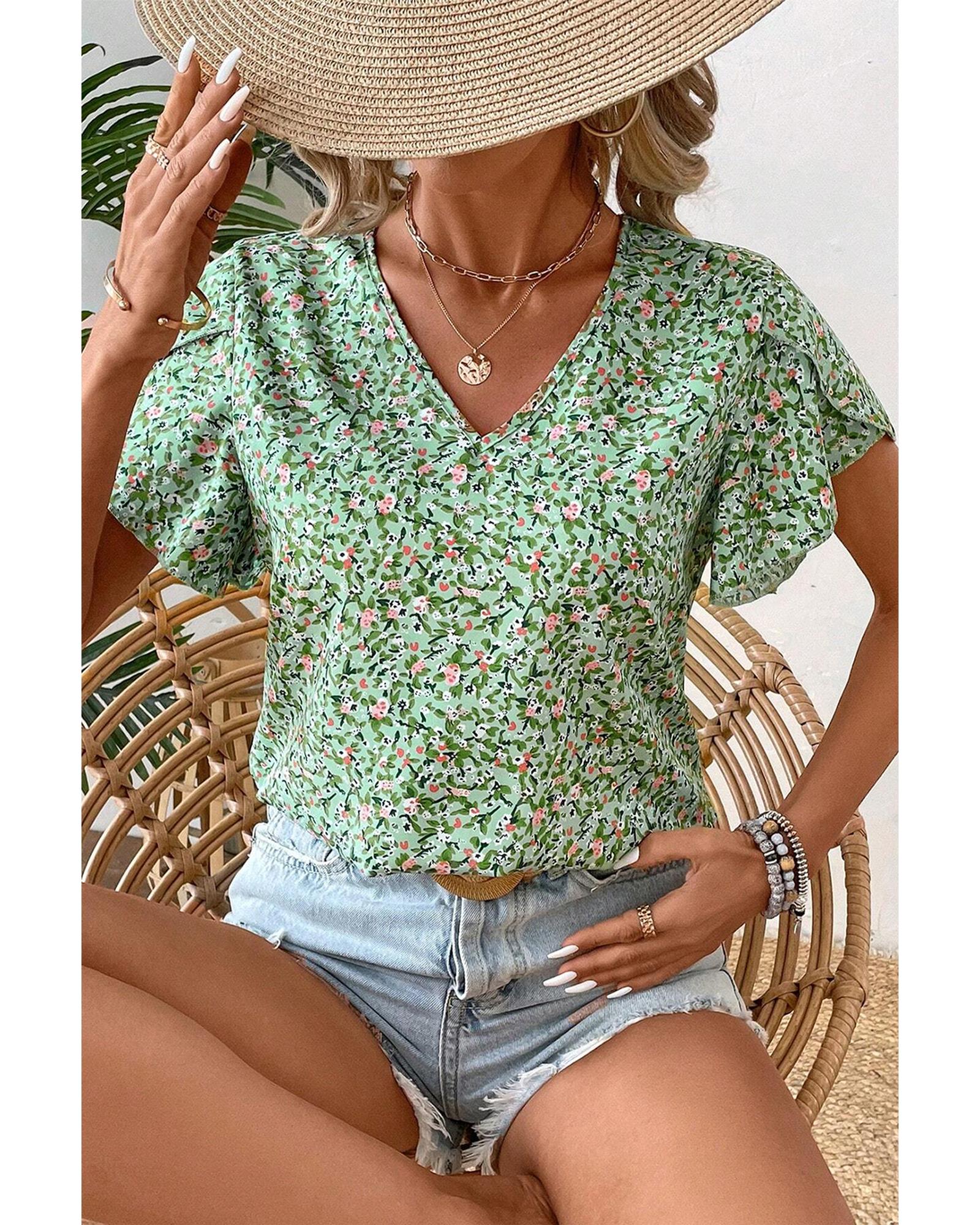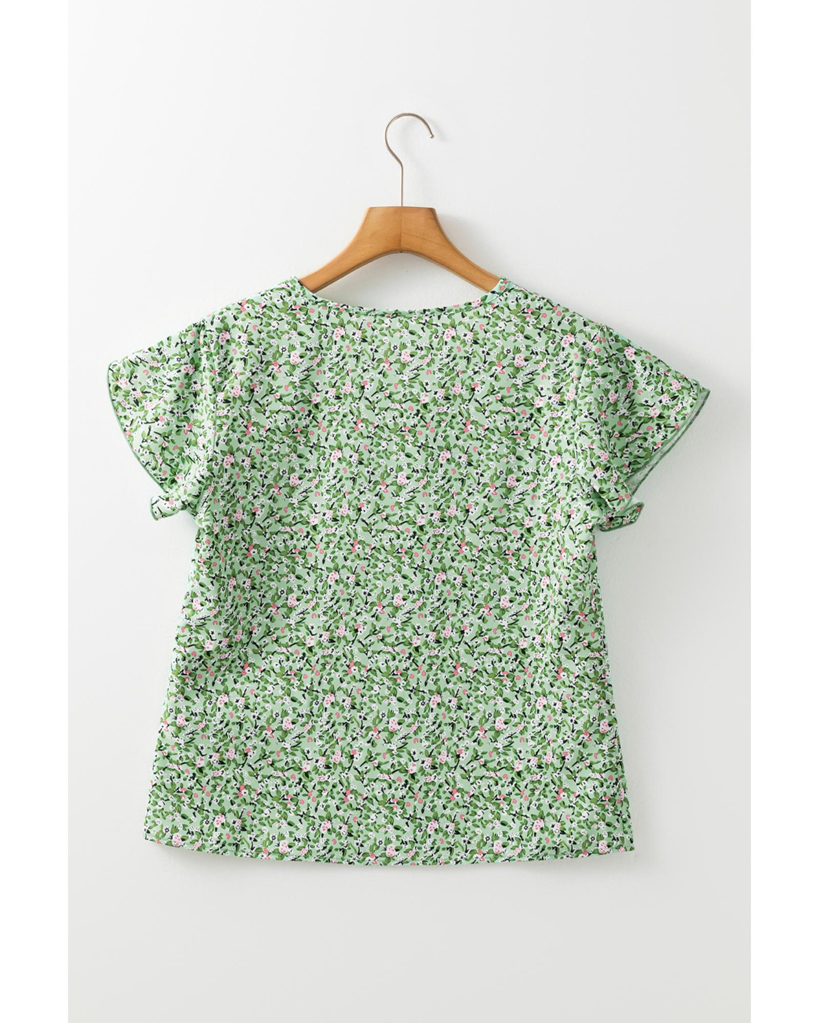 Green Boho Floral V Neck Wrap Short Sleeve Blouse – S