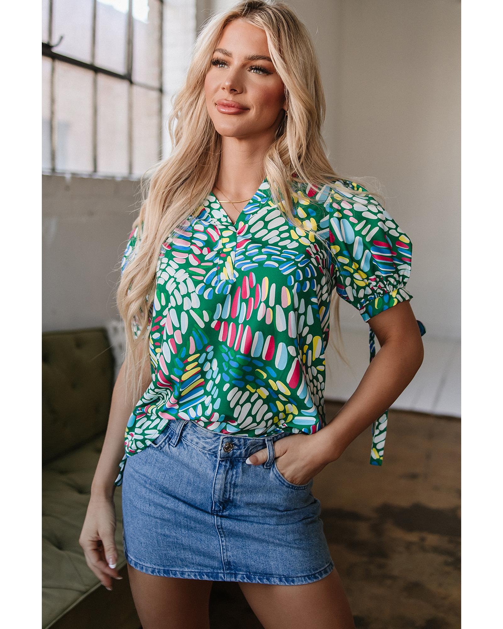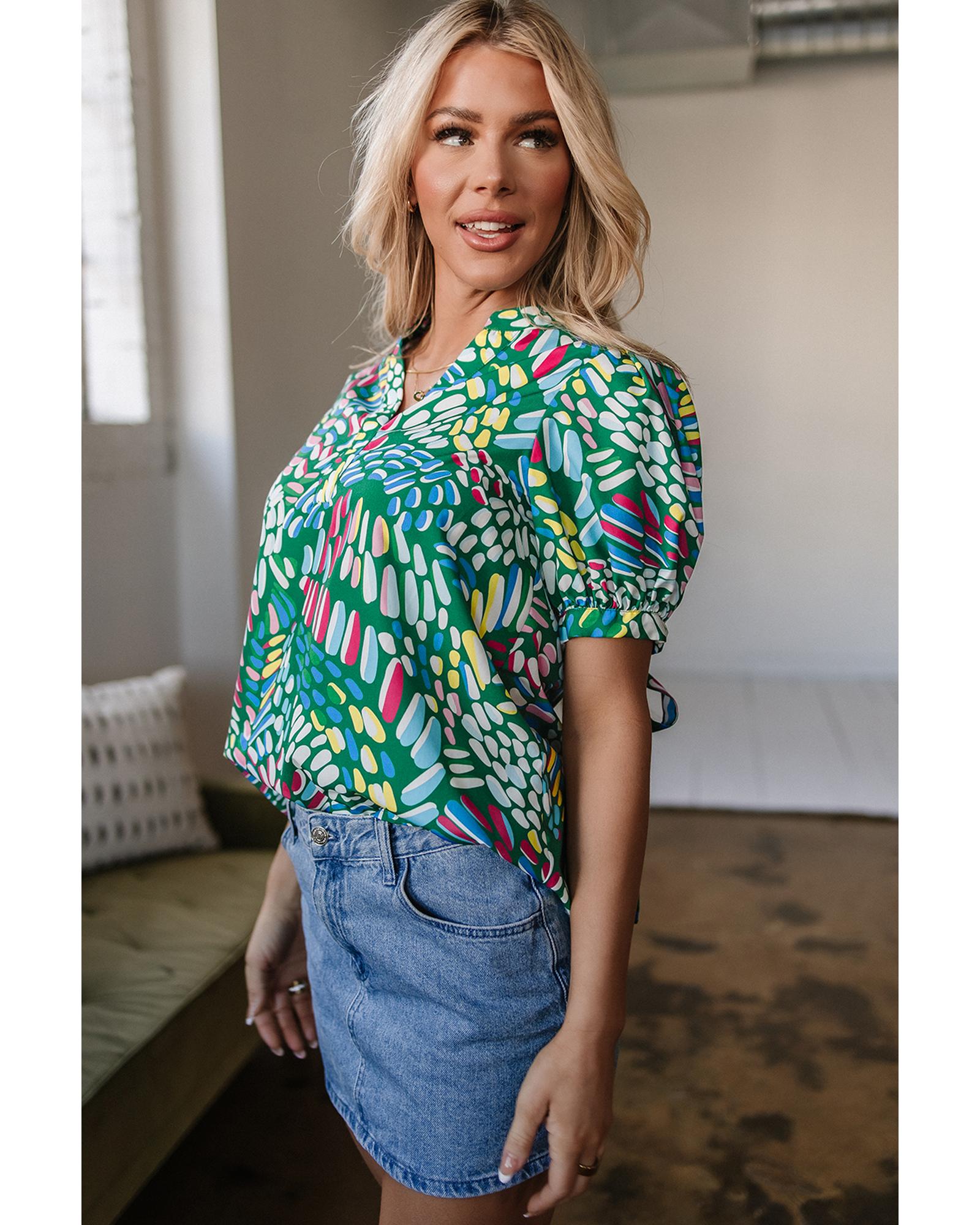 Green Brushwork Geometric Print Puff Sleeve Notched Neck Blouse – S
