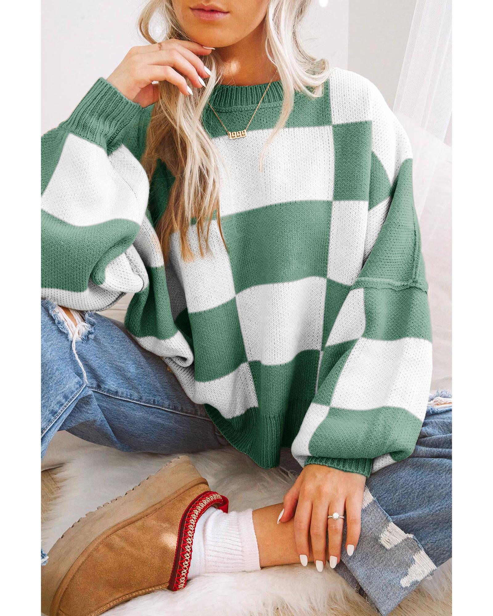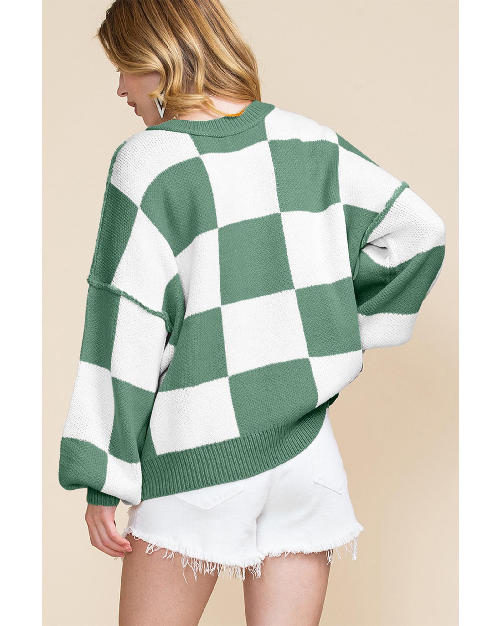 - Stylish Green Checkered Bishop Sleeve Sweater