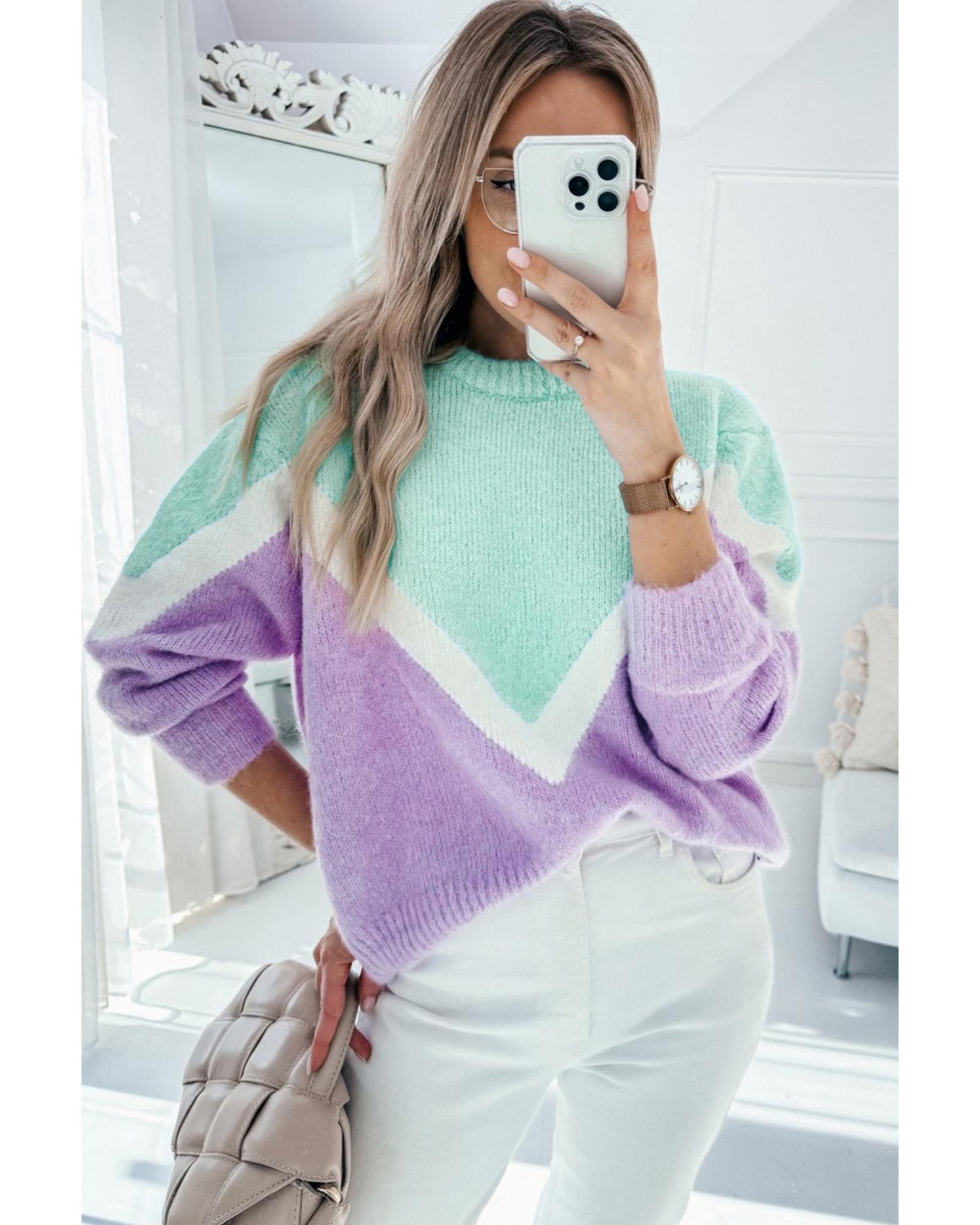 Green Chevron Colorblock Ribbed Knit Drop Shoulder Sweater – S